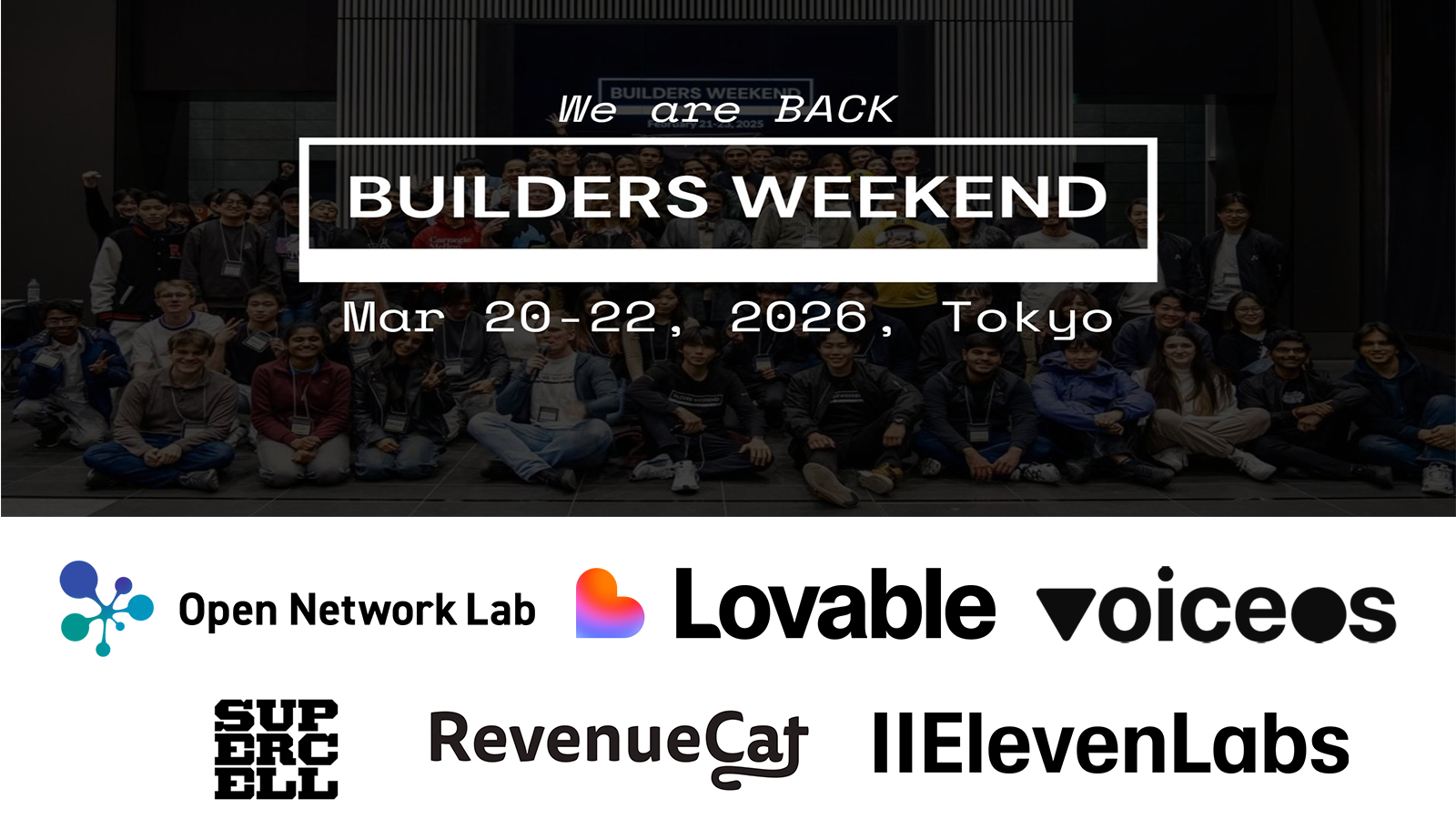 株式会社デジタルガレージ(東証プライム 4819、本社:東京都渋谷区、代表取締役 兼 社長執行役員グループCEO:林 郁、以下:デジタルガレージ)は当社が運営する「Open Network Lab(Onlab / 読み:オンラボ)」と世界中のスタートアップや投資家、大企業、学生などが集結する世界を目指すスタートアップのためのイベントを運営する「Takeoff Tokyo」共催で、AIハッカソン「Builders Weekend 2026」を2026年3月20日(金)〜22日(日)に渋谷パルコDGビル18階「Dragon Gate」にて開催します。
