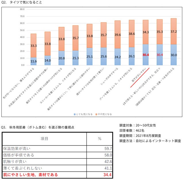一方、Q2の「気になる」ことについては、毛玉やニオイ悩みと同レベルで、約65%が「股下のズレが気になる」と回答。また、「秋冬用肌着を選ぶ際の重視点」を聞いたところ、肌に優しい生地や素材のニーズが高く、直接肌へあたるものへのケア意識があることがわかりました。そこで、これらの潜在ニーズに対応する商品として「ズレないタイツ」と「肌側綿混タイツ」を開発しました。