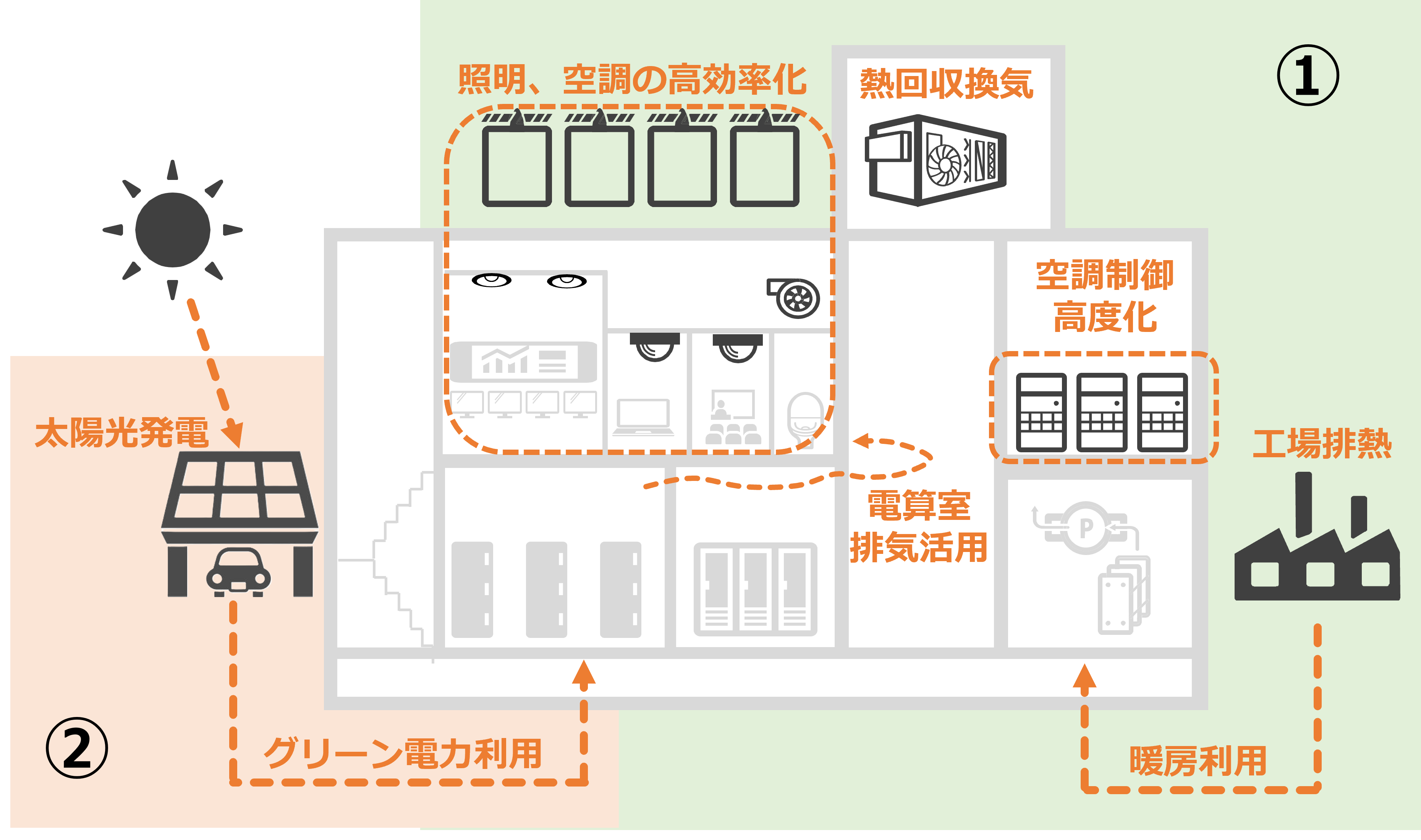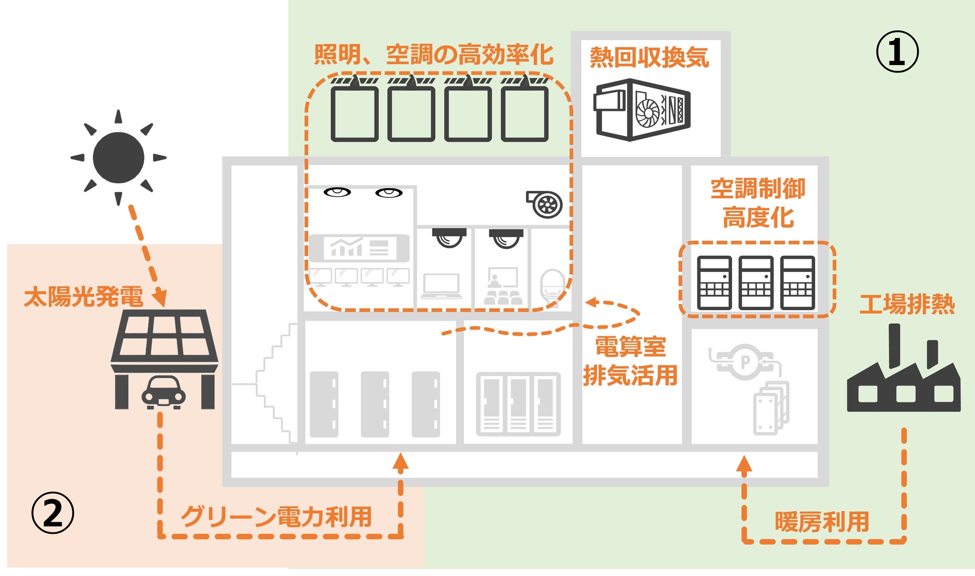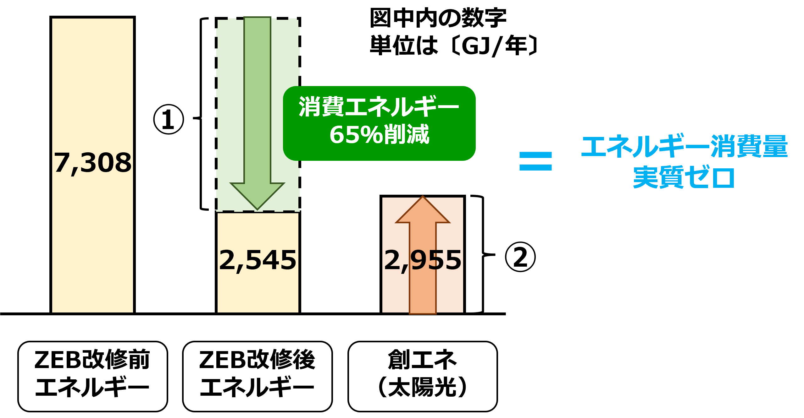 ①高効率な設備への更新による65%の省エネルギーの実現