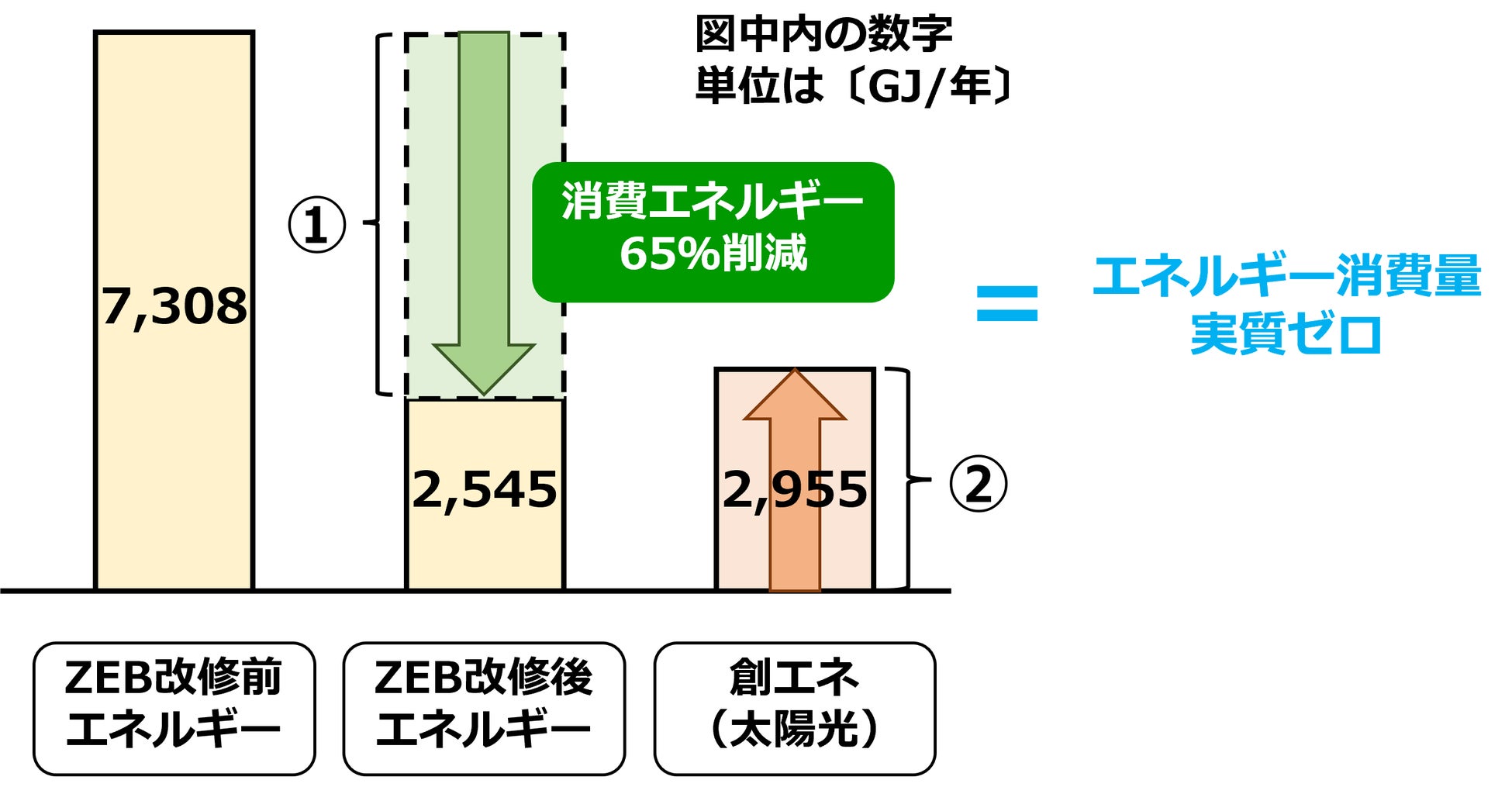 ZEBの条件として、基準一次エネルギー消費量※3の50%以上の省エネを達成する必要があります。この条件の達成に向け、PCで使用する空調・換気・給湯・照明を高効率な機器へ更新します。これにより4,763GJ/年の省エネとなり、改修前との対比で65%省エネが可能になります。この省エネ効果は、一般家庭の年間電力使用量を400kWhとした場合、約3,300世帯分に換算できます。