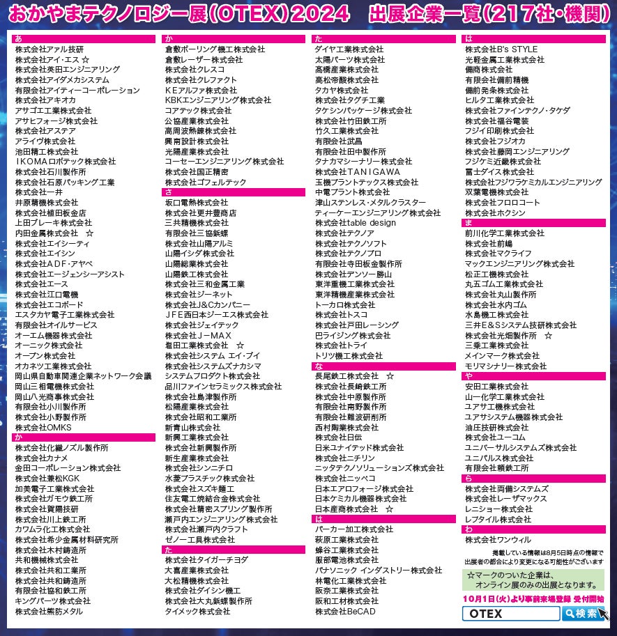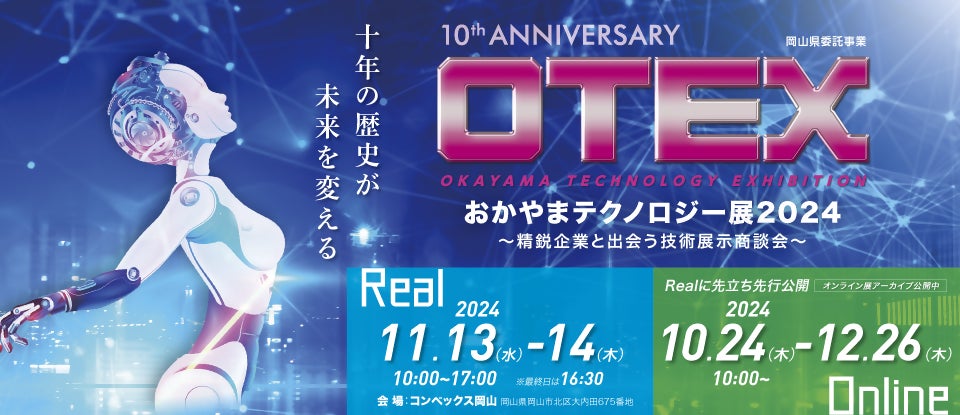 今回、2024年11月13日(水)・14日(木)の2日間、コンベックス岡山を会場に中四国最大級の展示商談会「おかやまテクノロジー展(OTEX)」を開催。併せて、10月24日(木)~12月26日(木)の期間ではオンライン展も開催します。