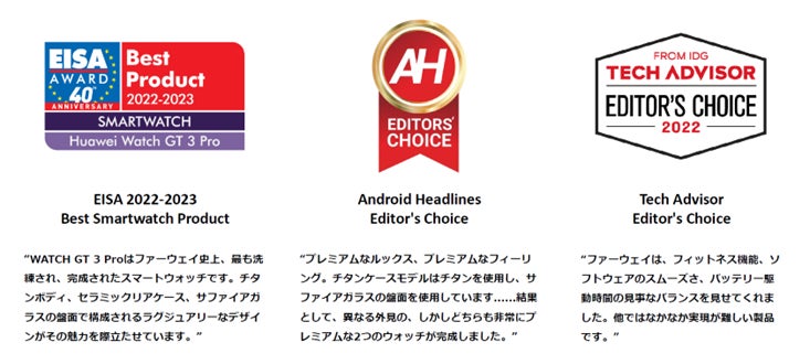 このたび『HUAWEI WATCH GT 3 Pro』は、複数の審査を通過し、「EISA AWARD 2022-2023」のベストスマートウォッチ賞を受賞したほか、「Android Headlines」と「Tech Advisor」でも、「EDITOR’S CHOICE 2022」に選ばれています。『HUAWEI WATCH GT 3 Pro』は、ビジネスシーンに適した高級感のあるエレガントなデザイン、卓越したロングバッテリー、豊富な健康モニタリング・スポーツモニタリング機能により、世界中の消費者やメディアから注目され、高い評価を得ました。