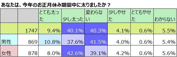 次に正月休みが1日以上あった1,747名の男女に、正月休み期間中に太ったか否か聞きました。全体では、「とても太った」が9.4%、「少し太った」が40.1%で合わせると49.5%と約半数の人が太ったと答えました。「変わらない」は40.3%、「少しやせた」は4.1%、「とてもやせた」は0.6%とやせた人は合わせて4.7%と少数派でした。