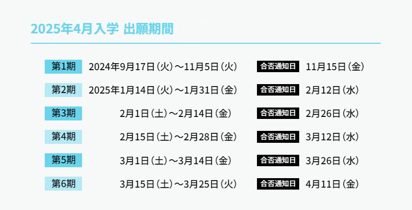 ・2025年度春入学への出願は第1期〜6期で受付。第1期は9月17日より出願受付開始