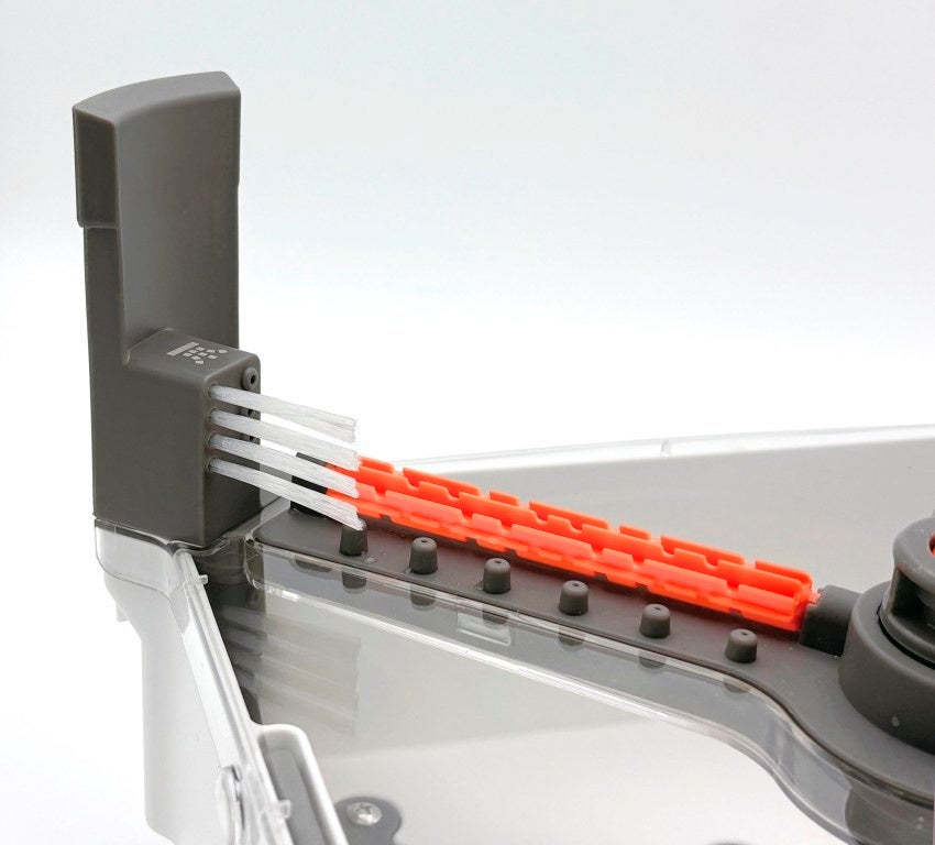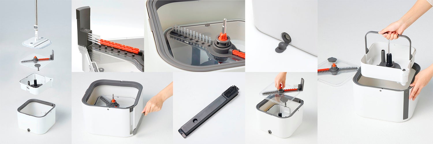 モップをセットして上下に動かすと、15か所の水噴射口から水が噴き出し、モップ全体をしっかり洗浄。バケツには洗浄タンク2.5L/汚水タンク2.5Lの大容量タイプを採用。さらに、底面用・側面用の3タイプのブラシが、繊維に絡みついたゴミや汚れをしっかりかき出します。汚水の排水もフタを開けるだけ。付属の掃除ブラシでバケツ内のお手入れも簡単。カバーは取り外せるので、洗浄後の片付けもスムーズです。