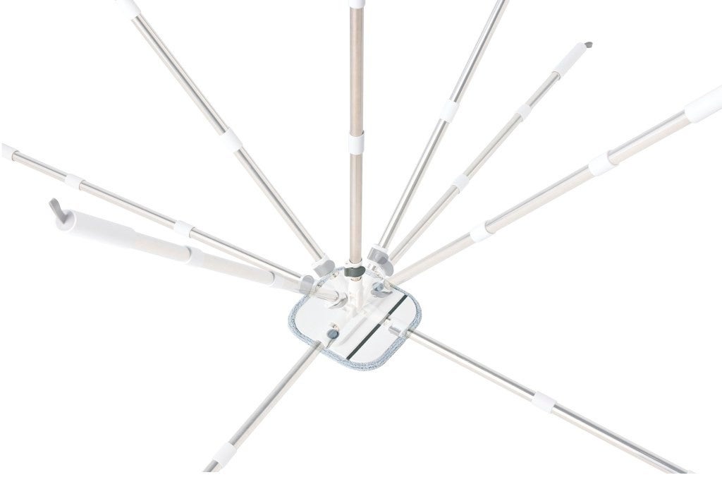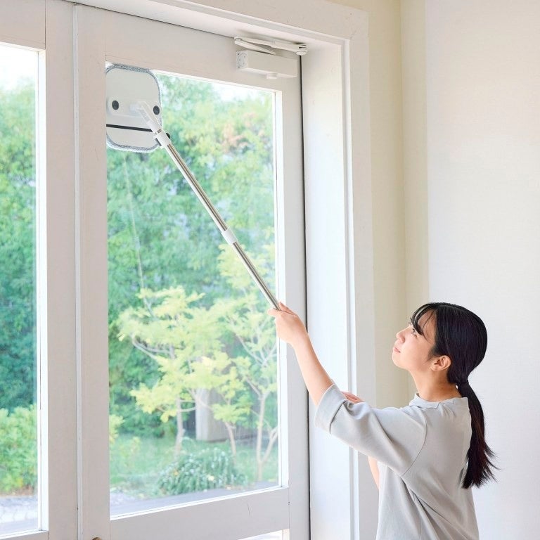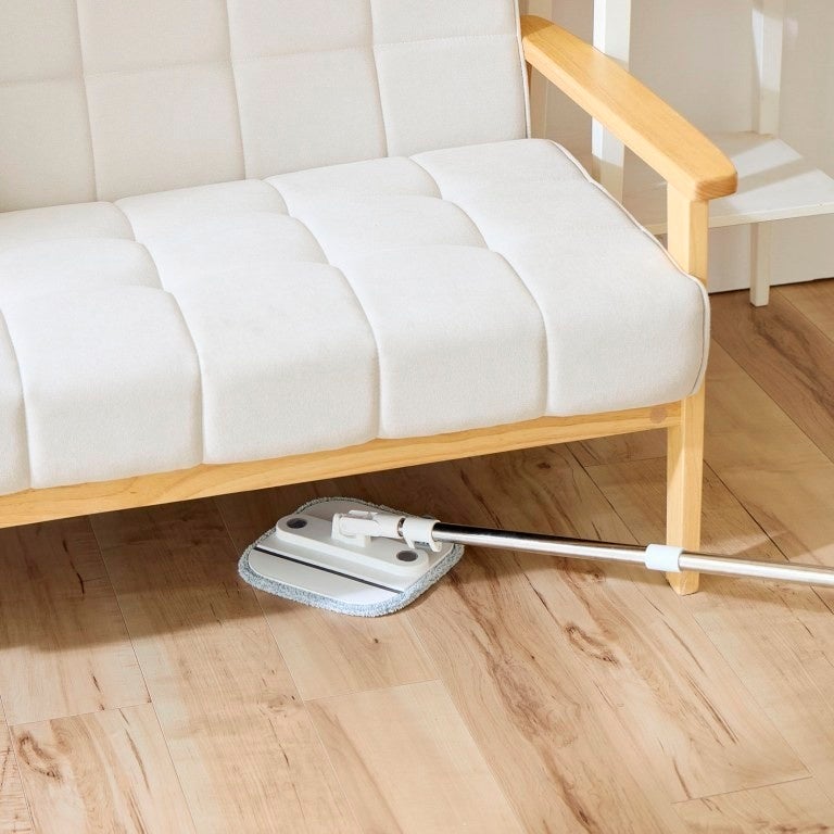 ヘッドは360°回転仕様。モップが折れて角にフィットするので、壁際や部屋のすみまでしっかり掃除できます。途中、手を放すときはモップが自立するのでしゃがんだりしなくて良いのも便利。ハンドルを倒せばソファの下などの低いスペースもラクラク。床はもちろん、階段・壁・窓掃除まで幅広く活躍します。