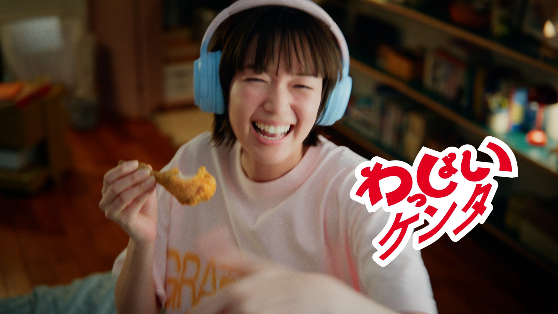 店内でチキンにかぶりつく佐藤さん。その一口に、思わず表情がほどけます。そこへ、「この人、いっつもしあわせそう」という声が重なり、佐藤さんはふっとカメラを見て「へ?」とひと言。物語は、そんな何気ない瞬間から始まります。