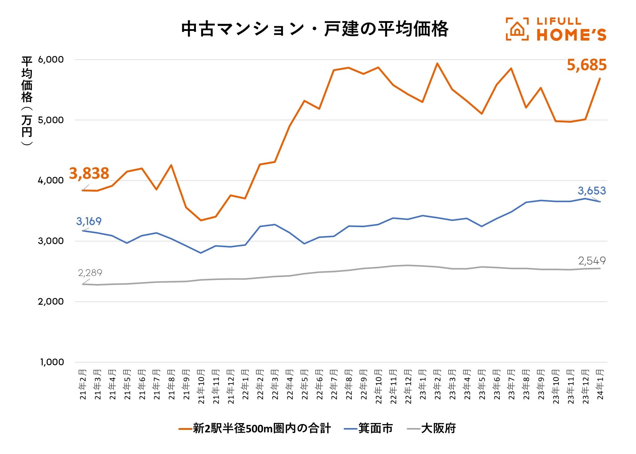 一方、延伸により開業する新駅「箕面船場阪大前」「箕面萱野」からそれぞれ半径500メートル圏内にある物件のみに絞った場合、2021年2月には3,838万円だったのに対し、2024年1月には5,685万円と3年間で約1.5倍(+48.1%)の上昇となり、箕面市を大きく上回る伸びを示しました。