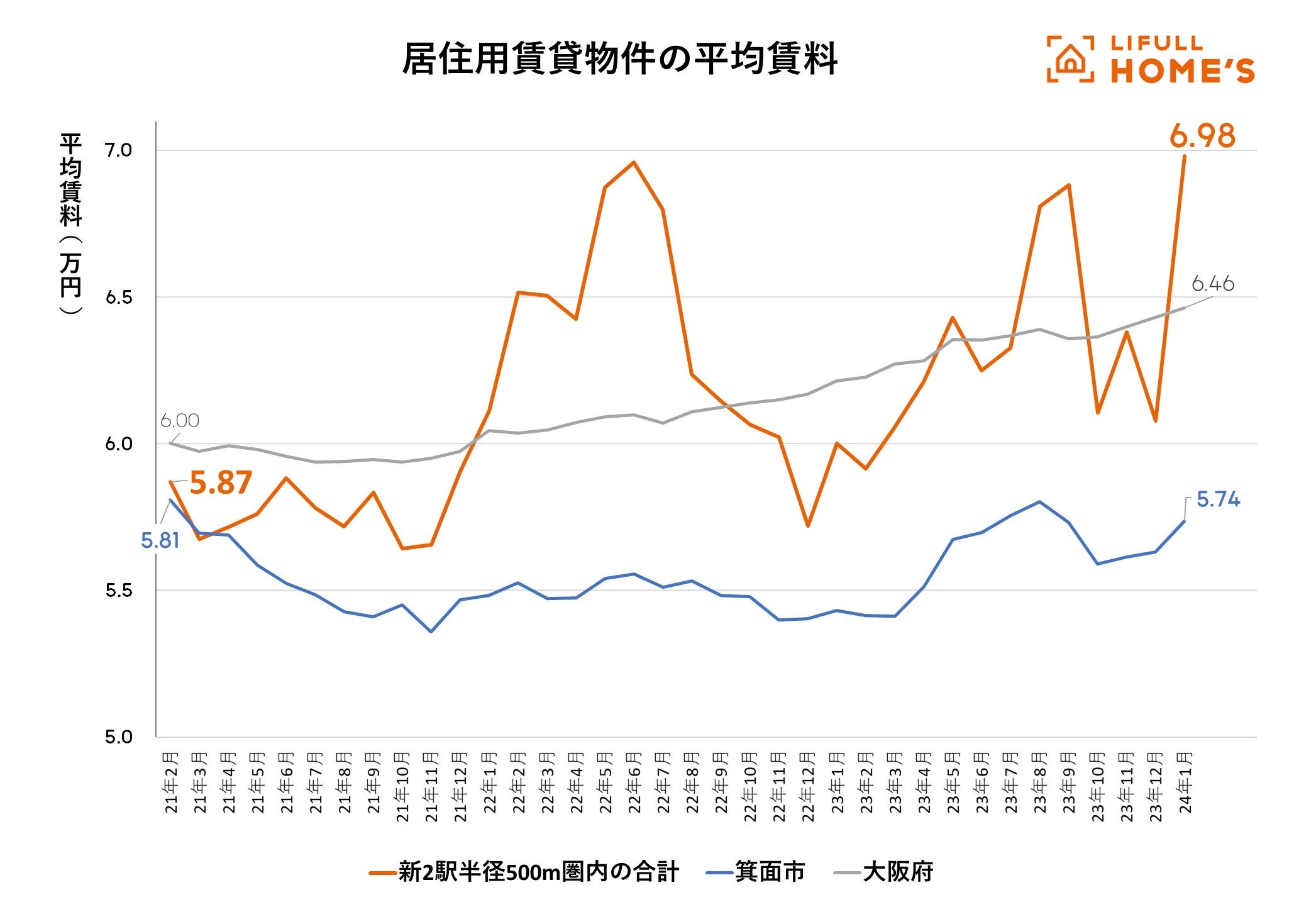 賃貸物件の平均賃料は、箕面市全域で2021年2月に58,098円、2024年1月では57,359円となり、3年間で1.3%下降しています。一方、延伸開業する新駅「箕面船場阪大前」「箕面萱野」のそれぞれ半径500メートル圏内にある物件のみに絞った場合、ボラティリティ(価格の変動幅)が大きいものの2021年2月には58,701円だったのに対し、2024年1月には69,814万円と3年間で約1.2倍(+18.9%)の上昇となりました。一般的に、賃料相場は上がり下がりの動きは小さいものですが、3月の北大阪急行延伸開業以降は、さらに相場賃料が上昇する可能性もあります。大阪急行延伸沿線で賃貸を検討されている方はなるべく早めの住まい探しをお勧めします。