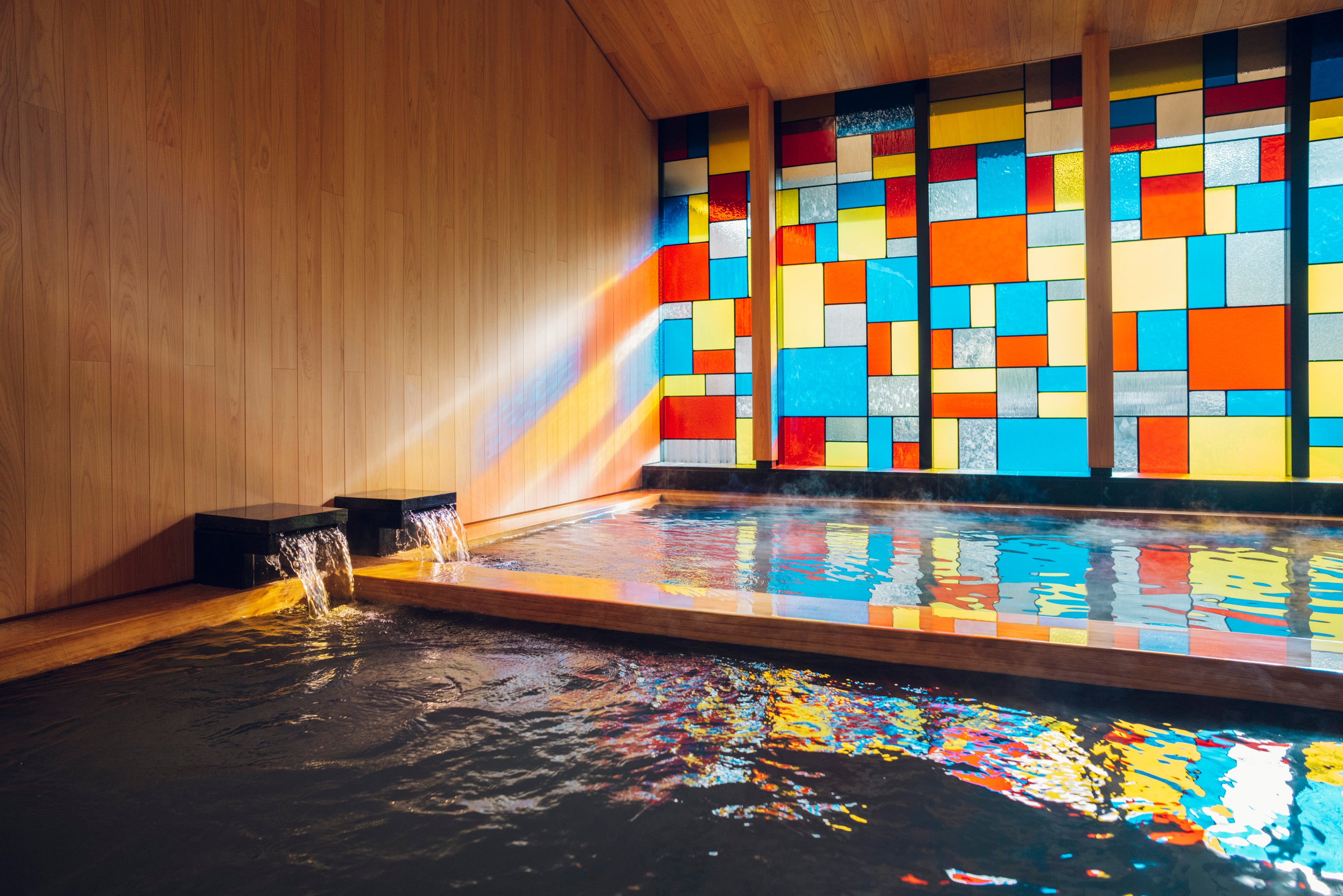 界 雲仙の大浴場は色鮮やかなステンドグラスを施しています。ステンドグラスを通して入る色鮮やかな光りに包まれながらレトロな雰囲気の中、温泉を楽しめます。界 雲仙のある、⻑崎県は鎖国時代の中でも⽇本で唯⼀海外に港が開かれ、中国、ポルトガル、オランダ、アジアから最先端の⽂化や⽣活様式が伝わりました。その中でも、⻑崎に定着したのは光の⽂化。温泉に入りながら、ステンドグラスの優雅な光りで色鮮やかなレトロ空間を温泉で楽しめます。
