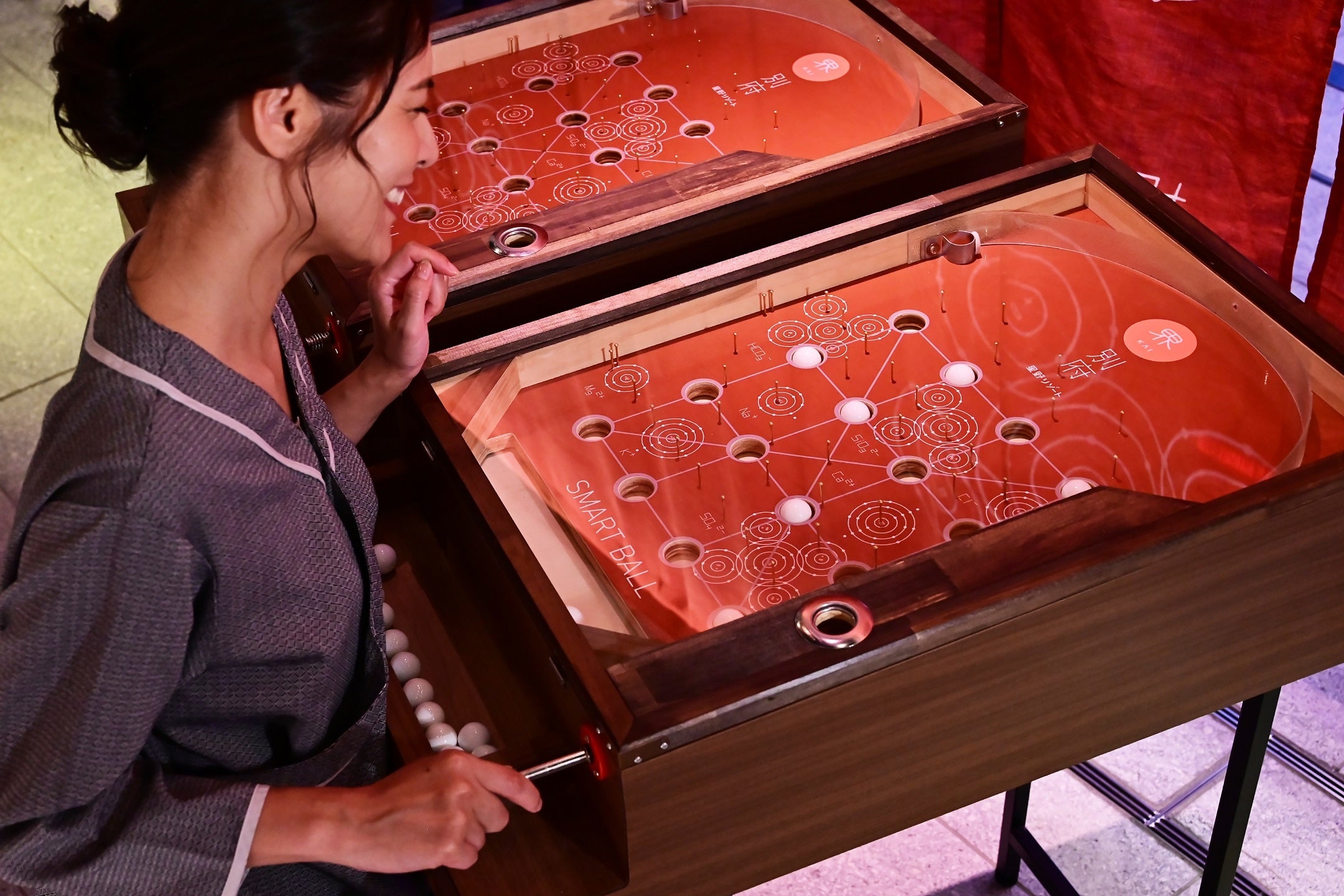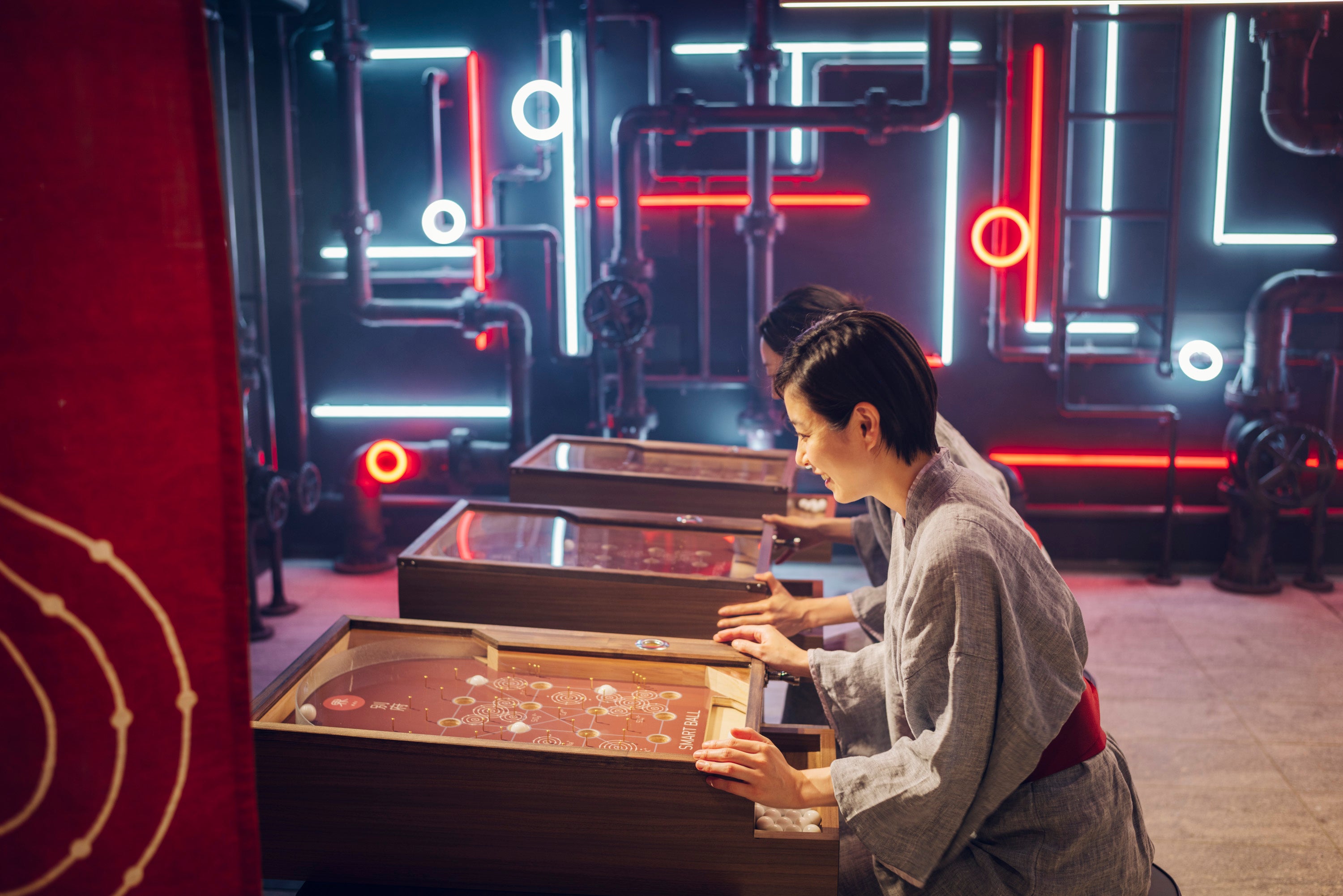 昔の街並みが残る別府駅周辺に位置する界 別府では、懐かしの「夜店」や温泉の配管をモチーフにした「ラボ」で昭和レトロを楽しむことができます。別府温泉の象徴、湯けむりが漂う「夜のドラマティック温泉街」では、施設の設計・デザインを担当した、隈研吾デザインの界 別府オリジナル「スマートボール」が楽しめます。景品として時代を感じる渋いレトロはがきをもらえ、旅の思い出として持ち帰りも可能。また、別府温泉街の路地にある温泉の配管をイメージしたレトロな見た目の「ラボ」や人々が集まる広場をイメージした「湯の広場」など館内での滞在を通して、レトロな空間を堪能できます。