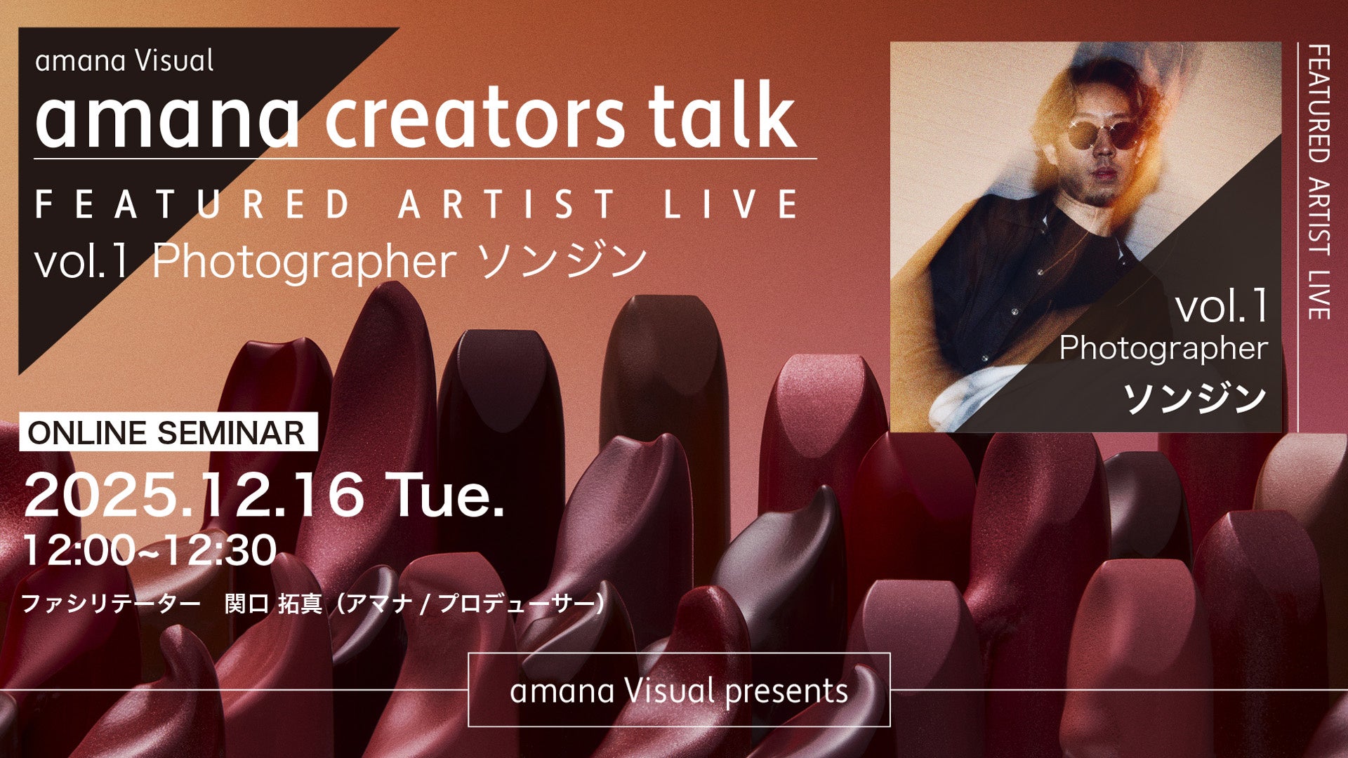 コミュニケーション変革をクリエイティブで実現する株式会社アマナ(本社:東京都品川区、代表取締役社長:金子剛章、以下「アマナ」)は、2025年12月16日(火)、『amana creators talk FEATURED ARTIST LIVE【vol.1 Photographer ソンジン】』をテーマにオンラインセミナーを開催します。