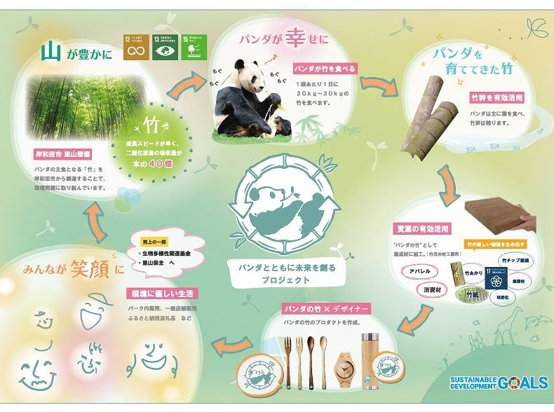 里山を荒廃させる竹を伐採し、ジャイアントパンダの食事として活用することで里山の環境を守り、これまで廃棄していたジャイアントパンダが食べない竹の幹の部分や食べ残した竹、糞を有効資源としてアップサイクルを推進するプロジェクトです。