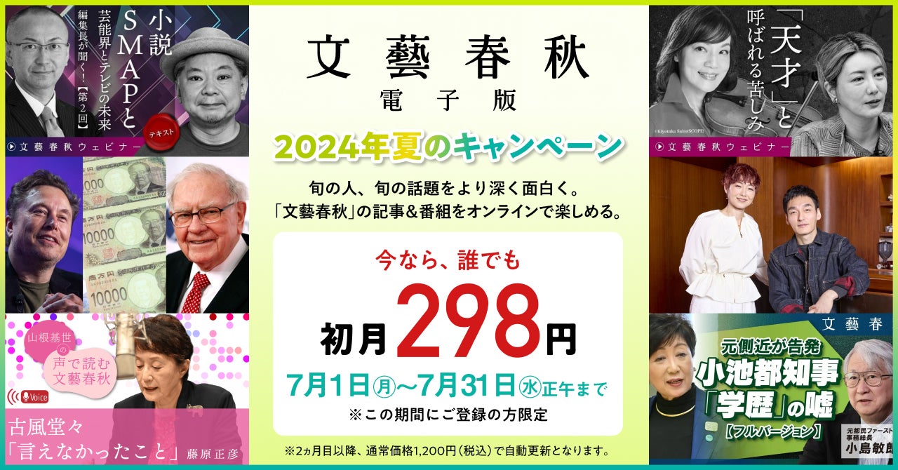 株式会社文藝春秋(本社:東京都千代田区 社長:飯窪成幸)が運営する『文藝春秋 電子版』は、2024年7月1日から31日正午までの1カ月間、夏のキャンペーンを開催いたします。