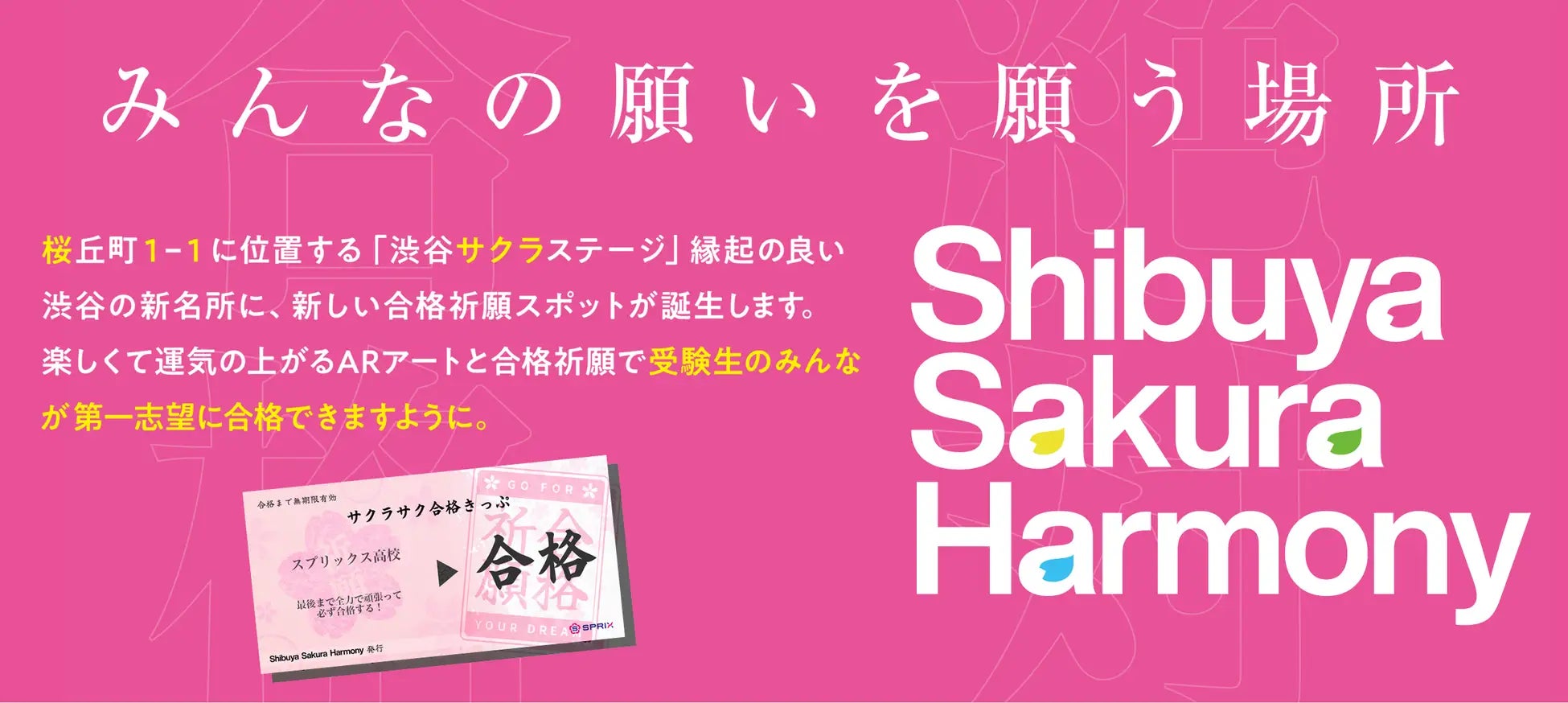 「渋谷サクラハーモニー」プロジェクトは、桜丘町1丁目1番地に位置する「渋谷サクラステージ」に学生文化の新たな拠点を作り、テクノロジーやエンターテインメントを駆使して受験生の交流の場を提供することで、学⽣と地域、そして企業が共に成⻑できる社会的な価値創造をめざします。渋谷サクラハーモニーのプロジェクト第一弾として、2025年1⽉14⽇(火)から2025年1⽉26⽇(日)の間、受験⽣や頑張る⼈を応援する、運気向上のAR体験ができるイベントを実施しました。