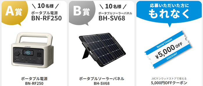 期間中、下記STEP1からSTEP2までの手順を完了して応募いただいたお客様の中から、抽選で各10名様に、A賞Victorポータブル電源「BN-RF250」、B賞Victorポータブルソーラーパネル「BH-SV68」をプレゼント!また、A賞とB賞を逃した応募者の方にも、もれなく5,000円OFFのスペシャルクーポンを進呈します。詳細は、以下のキャンペーンページよりご確認ください。