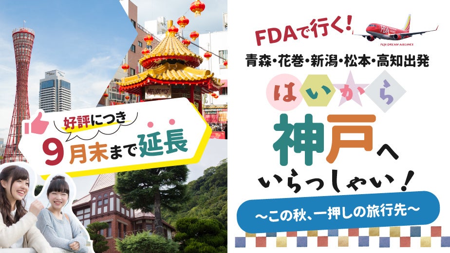 株式会社フジドリームエアラインズ(略称:FDA、本社:静岡県静岡市、代表取締役社長:楠瀬 俊一)は、 神戸空港を目的地とした航空券と宿泊がセットになった『FDAで行く!はいから神戸へいらっしゃい!』プランを、ご好評により販売期間を延長し、9月末日搭乗分まで販売いたします。