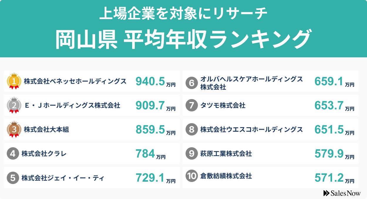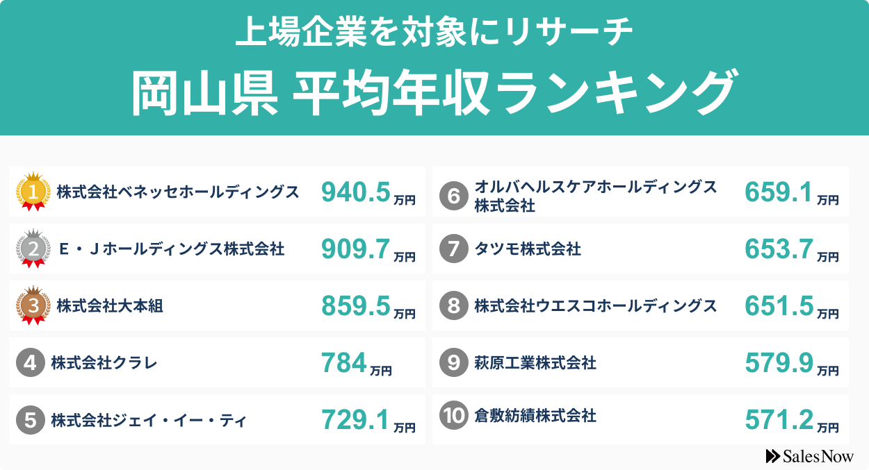 【岡山県】上場企業平均年収ランキングTOP10!/SalesNow DBレポート