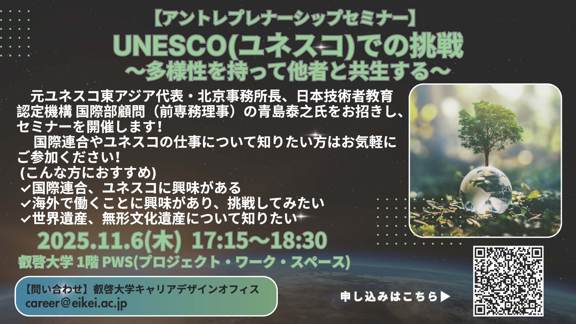 叡啓大学(学長:有信睦弘、所在地:広島市中区)は、2025年11月6日(木)17:15~18:30でアントレプレナーシップセミナー「UNESCO(ユネスコ)での挑戦~多様性を持って他者と共生する~」を開催します。