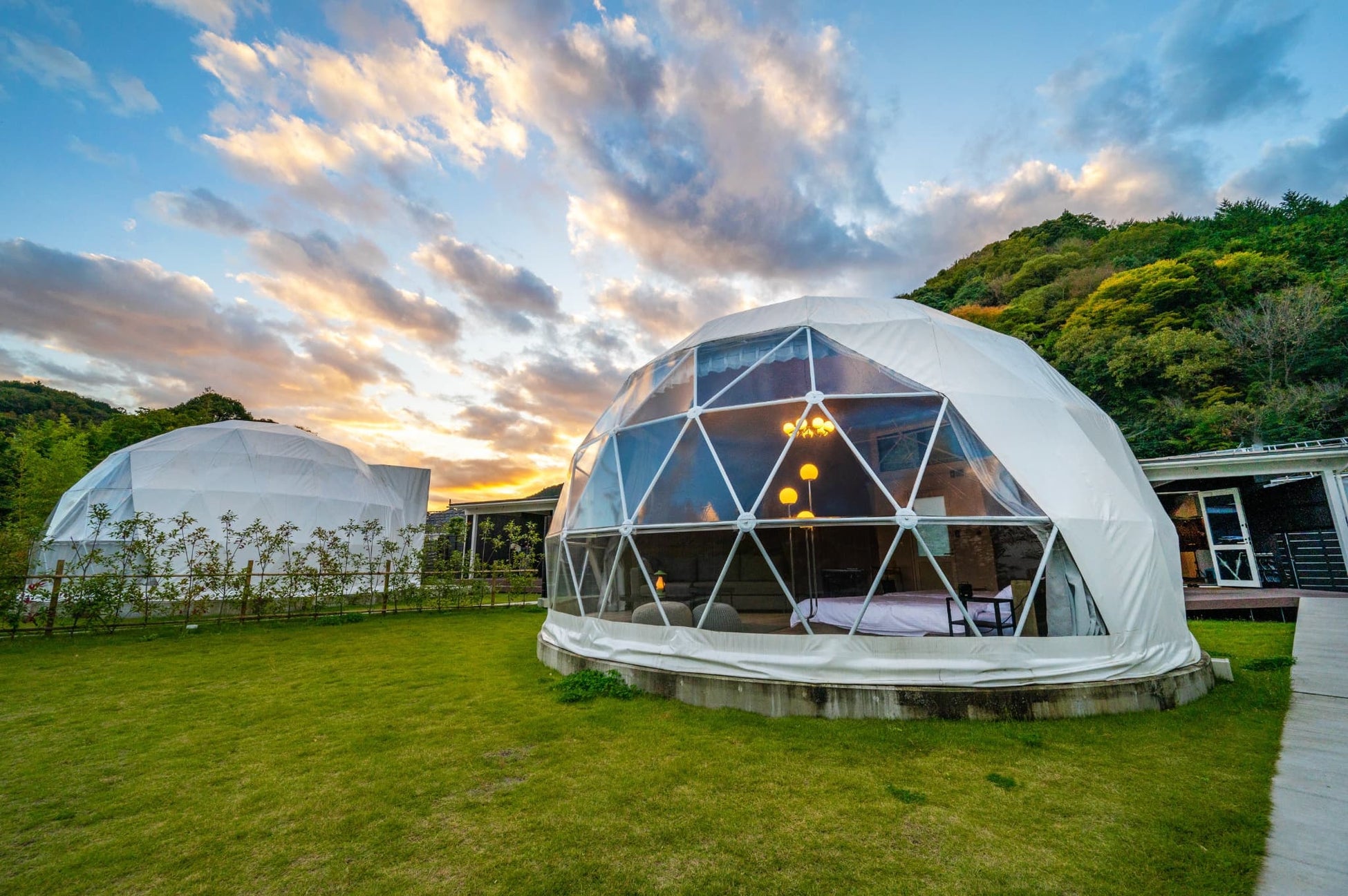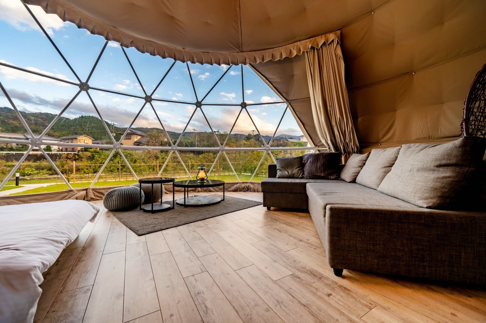 ・快適なグランピング空間:各部屋にはプライベート温泉を完備し、日常を忘れる贅沢な時間を演出。