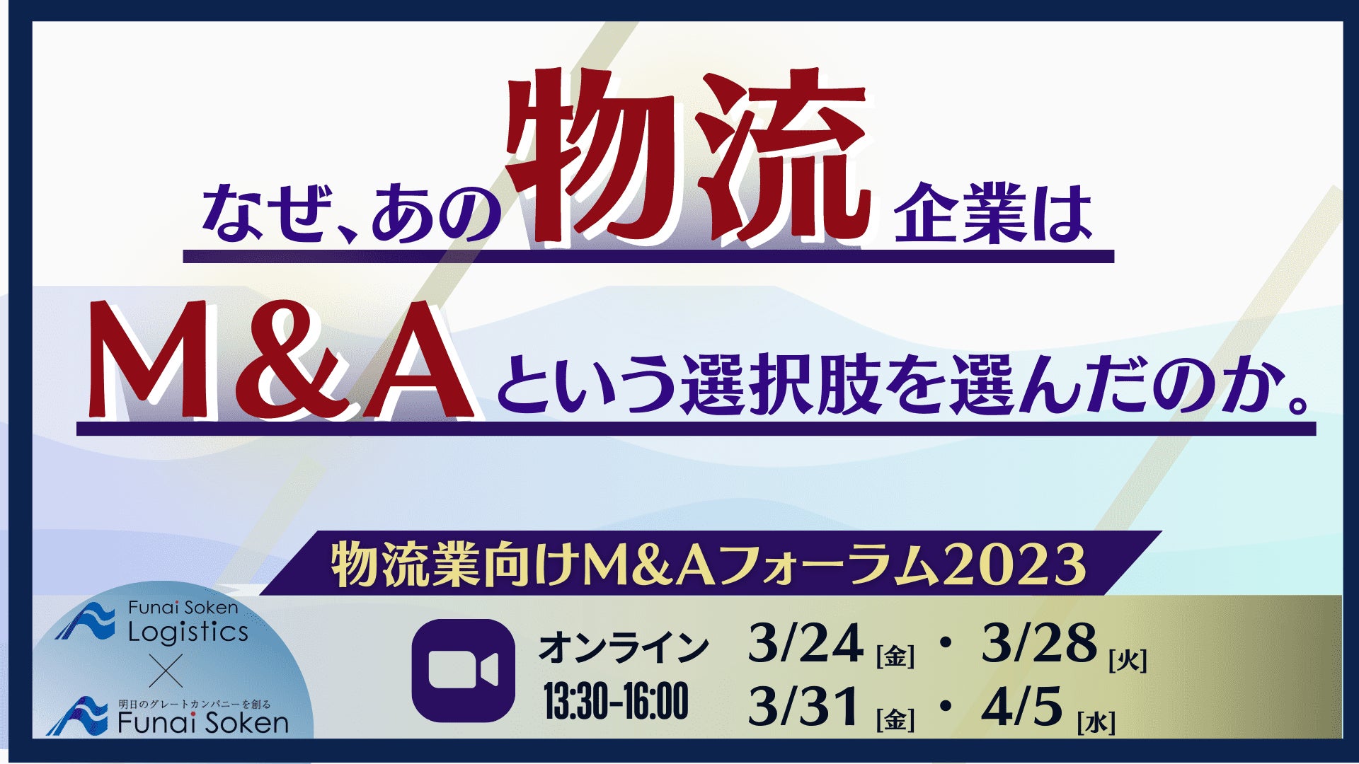 株式会社 船井総合研究所が主催するセミナー『物流業向けM&Aフォーラム2023』にて、物流業界の時流・2024年問題をどのように乗り越えていくか詳しく解説します。