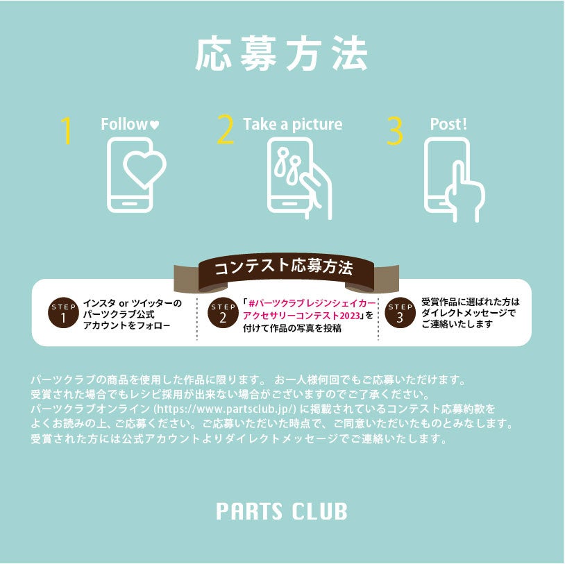 パーツクラブのパーツを使った作品を、【 #パーツクラブレジンシェイカーアクセサリーコンテスト2023 】を付けて、InstagramまたはTwitterへ投稿するだけ!
