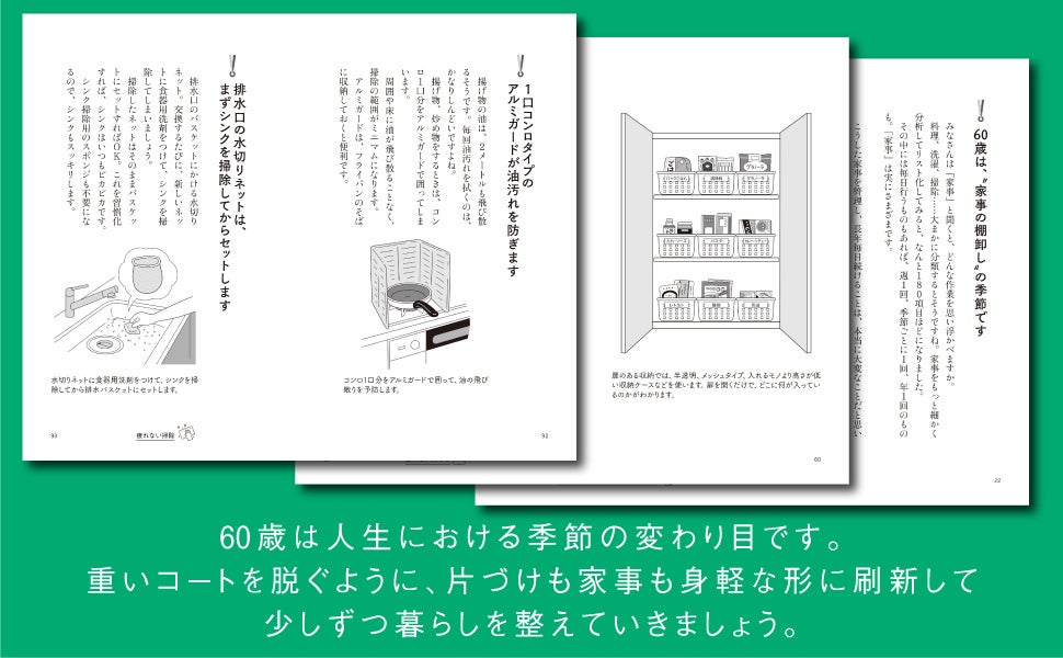 さらに「片づけ」の章では、終活をちょっと見据えた断捨離的な内容も収録しました。わかりやすいイラスト解説で「疲れない家事と片づけ」をお伝えします。