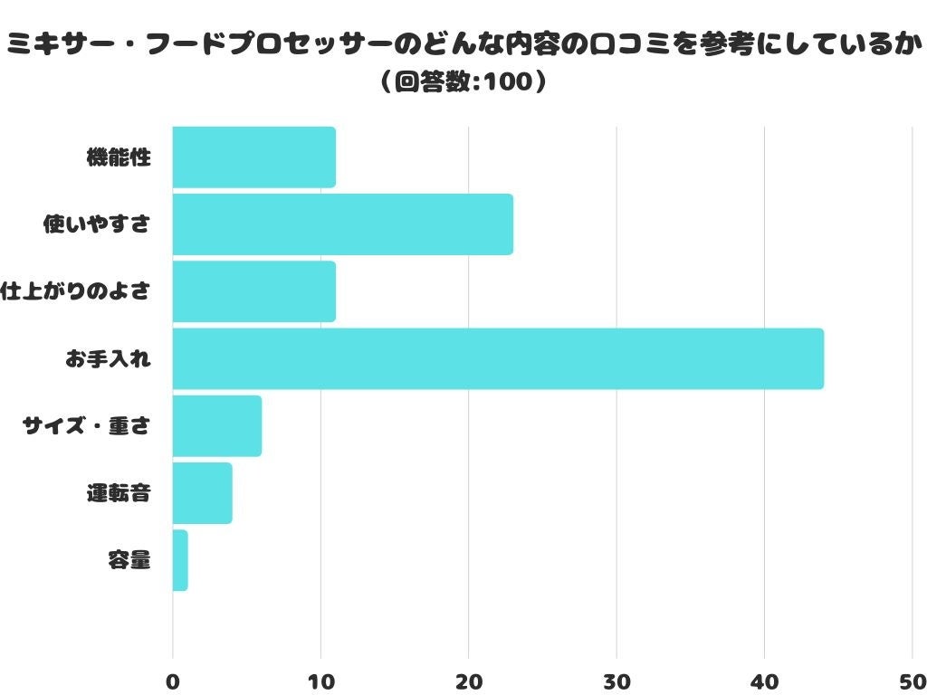 ミキサー・フードプロセッサーのどんな内容の口コミを参考にするかをアンケートにて調査したところ、1位は「お手入れ」でした。