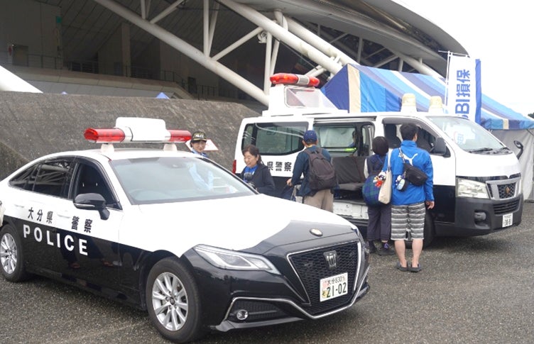 さらに、より多くの来場者の皆さまに交通安全について関心を持っていただけるようにと、大分東警察署はパトカーと事故処理車の展示・乗車体験コーナーを設置し、立ち寄ったお子さんたちに交通安全の重要性を伝えました。