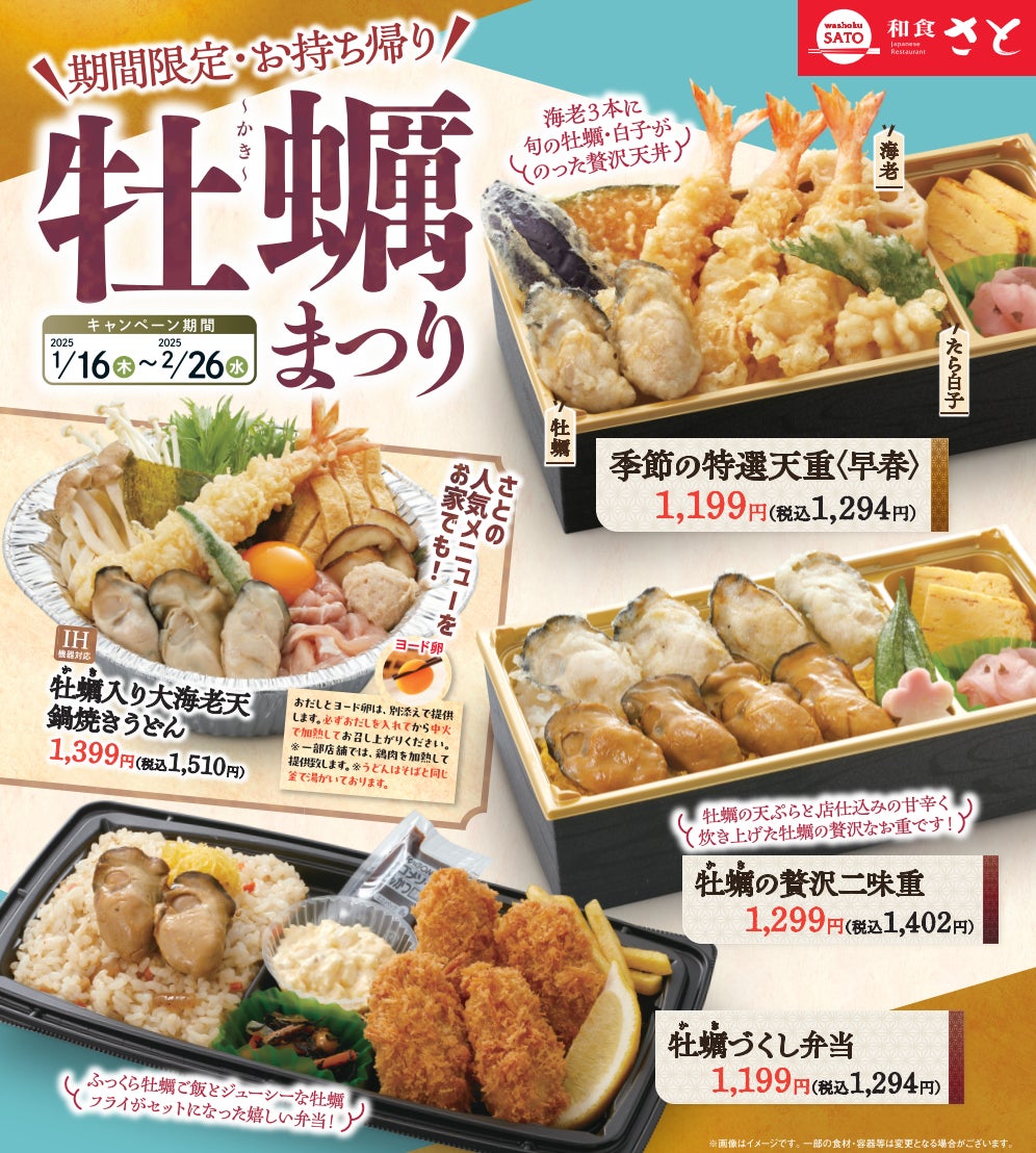 国内197店舗を展開する「和食さと」では、お持ち帰り『牡蠣まつり』と題して、牡蠣の天ぷらや牡蠣フライなど、牡蠣を使用したテイクアウトメニューを期間限定で販売します。また、お店で人気の「牡蠣入り大海老天鍋焼きうどん」を今回、テイクアウトの鍋メニューとして期間限定で販売します。コシのある太麺に、白菜やしめじなどの野菜と、鶏もも肉や鶏つくね団子などたっぷりの具材が入り、さらに卵は『ヨード卵・光』を使用!食べ応え抜群の大海老天ぷら、そして牡蠣も3粒入った、豪華な鍋焼きうどんです。さと特製のうどんつゆで炊いて、アツアツの鍋焼きうどんを是非お楽しみください。牡蠣たっぷりのお弁当や、寒い日にもぴったりな鍋焼きうどんを、期間限定で販売しますので、いつも和食さとをご利用頂いているお客さまも、初めてのお客さまも是非「和食さと」のテイクアウトキャンペーンをお楽しみください。