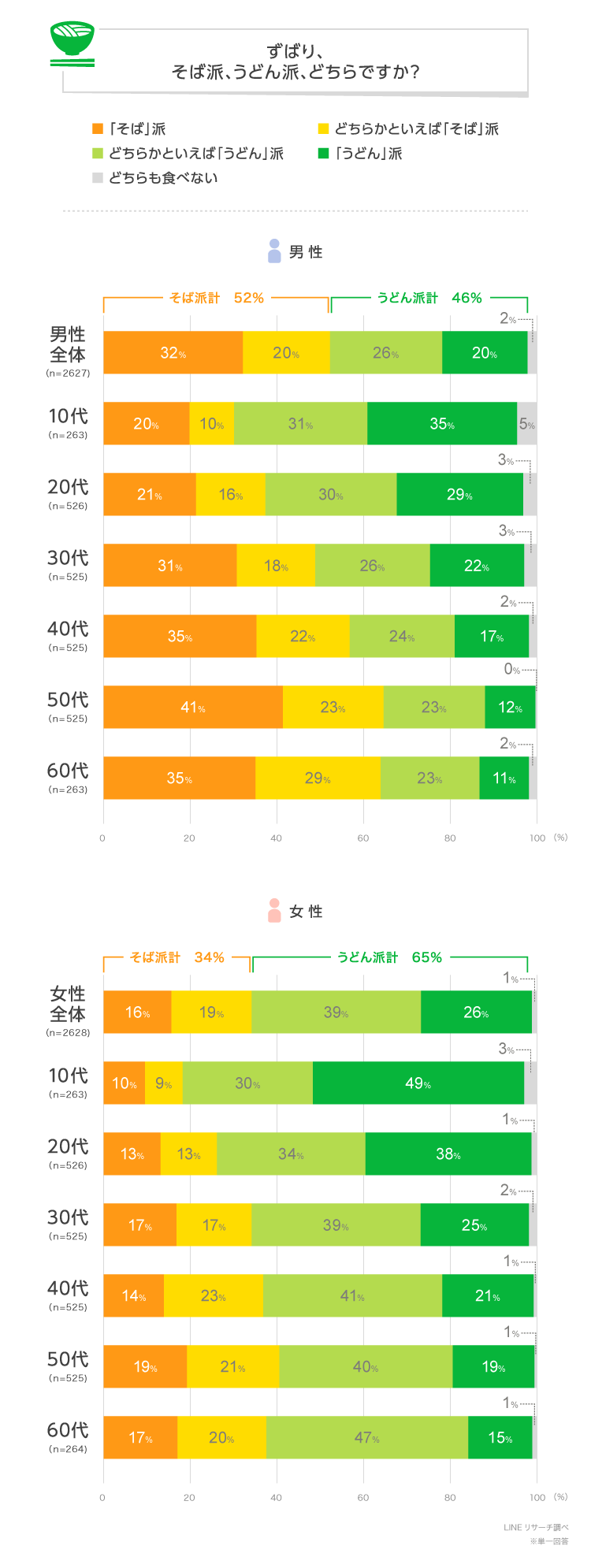 【LINEリサーチ】そば派?うどん派?全体では「うどん派」の割合が高い結果に。男女別・年齢別に異なる傾向もみられる