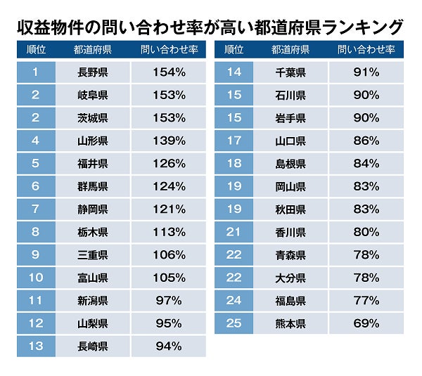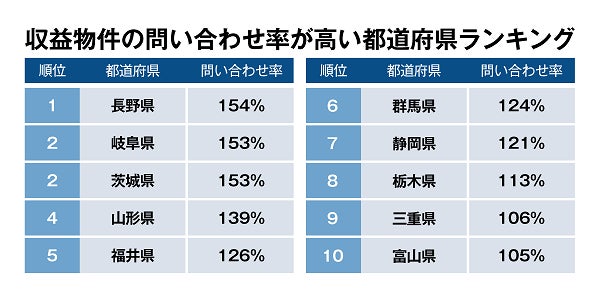 「収益物件の問い合わせ率が高い都道府県ランキング」トップ3は長野県、岐阜県、茨城県