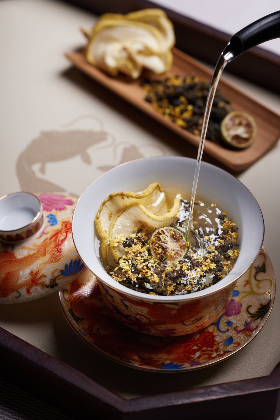 時代を先駆け真のモダンラグジュアリーを追求してきた「リージェント」。3年間の大改装を経て目を見張る変貌を遂げ、2023年にビクトリアハーバー上に佇む街のシンボルとして復活した「リージェント香港」からは、ミシュランガイド香港・マカオ2025でミシュランの2ツ星に掲載された「麗晶軒」のお茶と点心のセットをご紹介します。16年連続でシュランガイドに掲載される名店のシェフおすすめは、蒸しホタテの餃子、コウイカの団子、ロブスターの蒸し餃子がそろう「麗晶軒 こだわりの海鮮餃子3種」(218 HKD 税サ別)に、ティーソムリエがペアリングさせるのは、「リージェント養生茶—キンモクセイと雪梨の烏龍茶」(268 HKD 税サ別)。福建省産の安西烏龍茶に、乾燥した雪梨、キンモクセイの花など栄養価の高い様々な材料を加えた、爽やかな甘さの広がるお茶です。キンモクセイと蘭の香りが魚介類の新鮮さを引き立て、爽やかで甘い後味を残します。ヘルシーな蒸し料理と中国茶のマリアージュをご堪能ください。