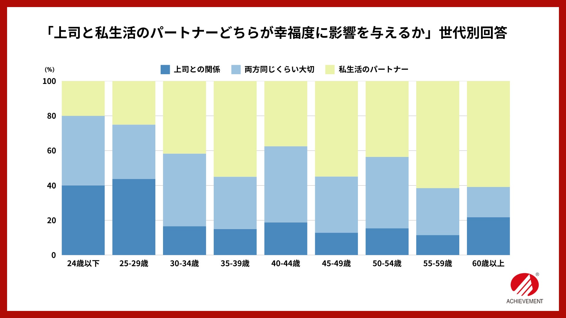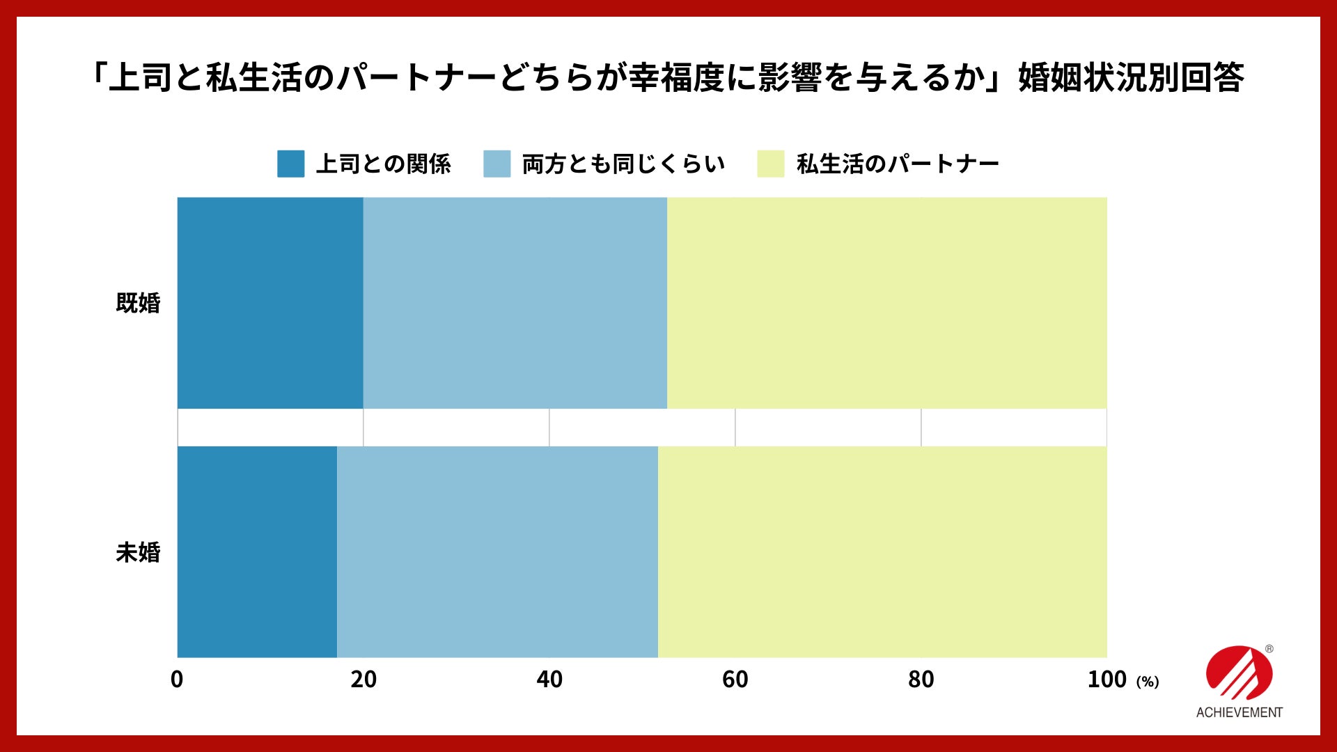 次に私たちは、「非リーダー層にとって上司との関係性が幸福度に大きな影響を与えるのではないか」という仮説のもと、上司との関係と私生活でのパートナーとの関係のどちらをより重視しているのかを調査しました。