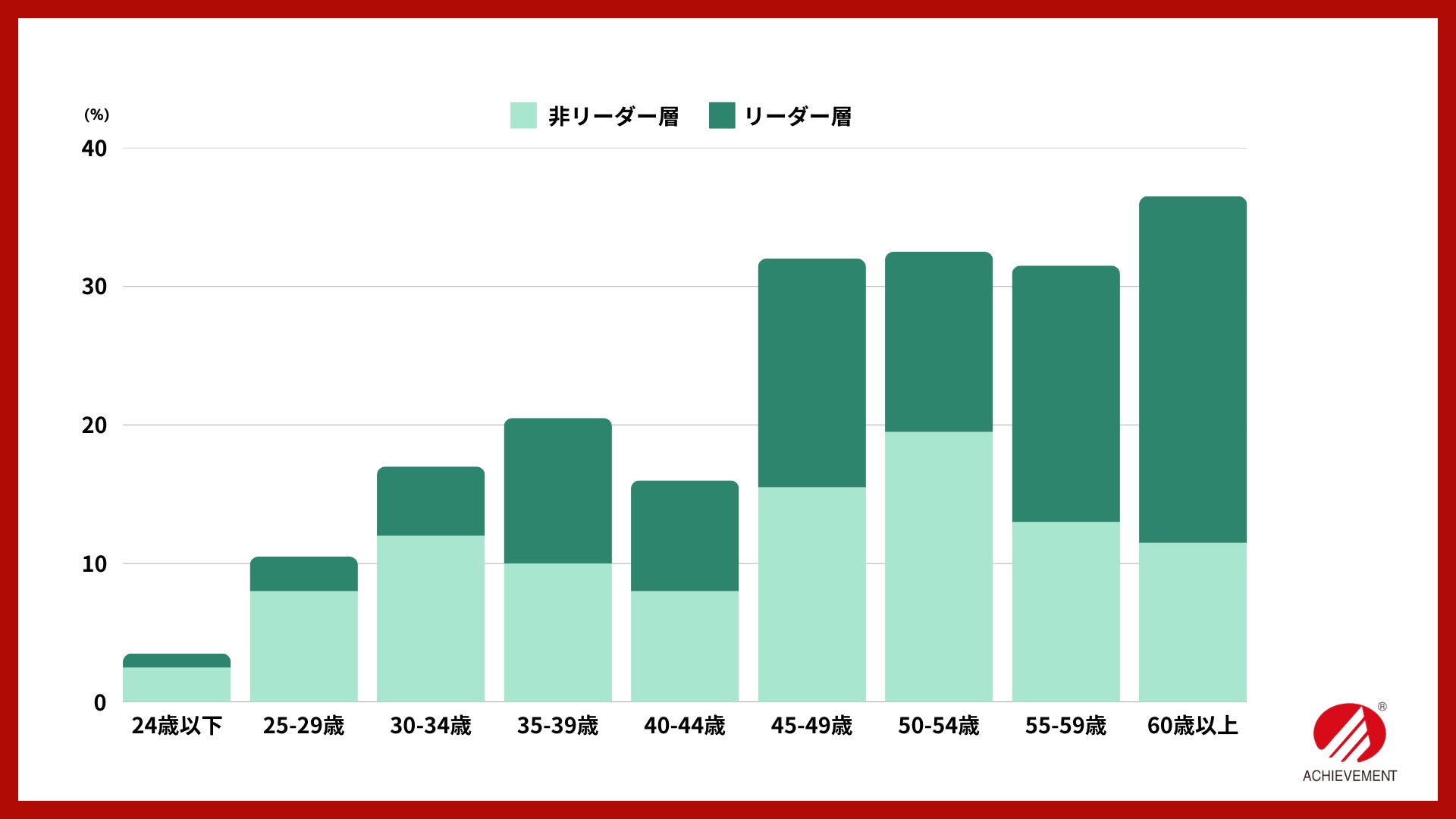 調査の結果、20代の非リーダー層の約8割が「上司との関係をより重視する」または「どちらも同じくらい重視する」と回答しました。近年のワークライフバランスへの意識が高まる中で、若手の非リーダー層における職場の人間関係が、私生活でのパートナーとの関係と同等、もしくはそれ以上に重要だと考えられていることが明らかになりました。また年齢が上がると、私生活でのパートナーとの関係を重視する人の割合も増えています。