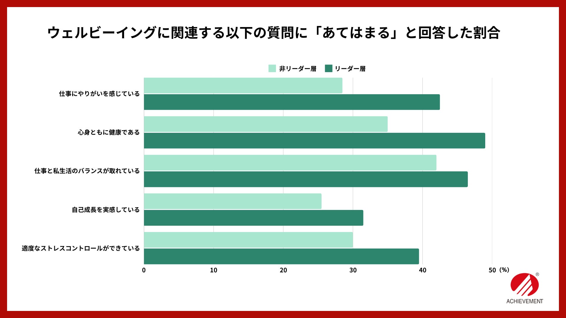 「仕事のやりがい」では約1.5倍の差(リーダー層42.5%、非リーダー層28.5%)