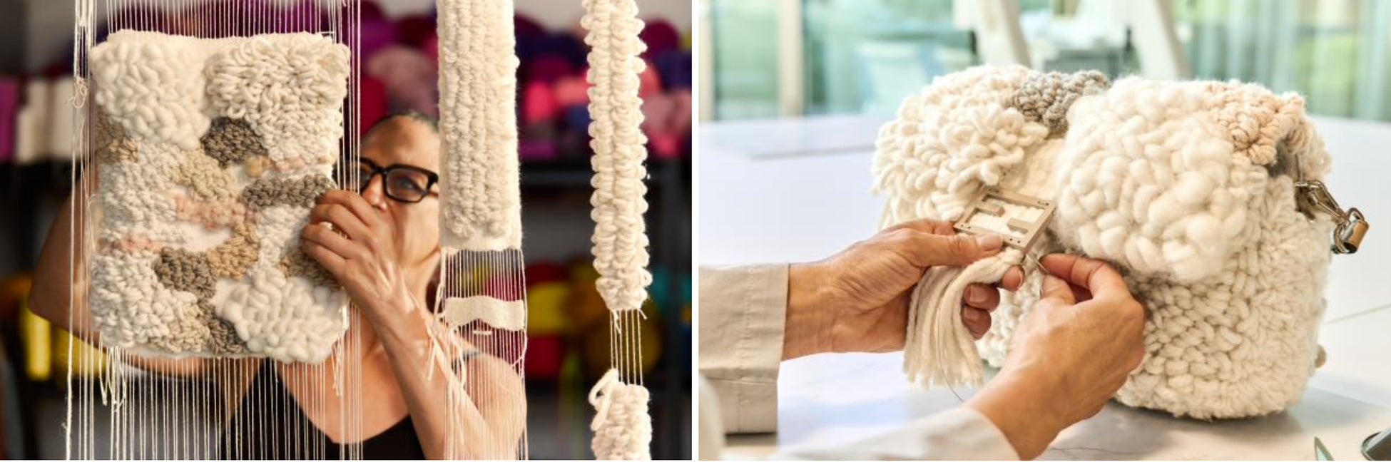 ミラーは工芸に対する揺るぎない愛と、構想から共同作業に至るまで、「ハンド・イン・ハンド」プロジェクトと共鳴する哲学を持っています。彼女の類まれなタペストリーは、いかなるツールも使わない、100年の手工芸の伝統を称えます。このアートフォームを習得するためにミラーは2年間を費やし、オーストラリア最古のデザイン機関であるスタートギャラリー&スタジオ(Sturt Gallery & Studios)でタペストリーの研究に没頭しました。そしてそこでフェンディの新しい「ハンド・イン・ハンド」による「バゲット」を生み出す優れた技法、リーヤノットを学びました。