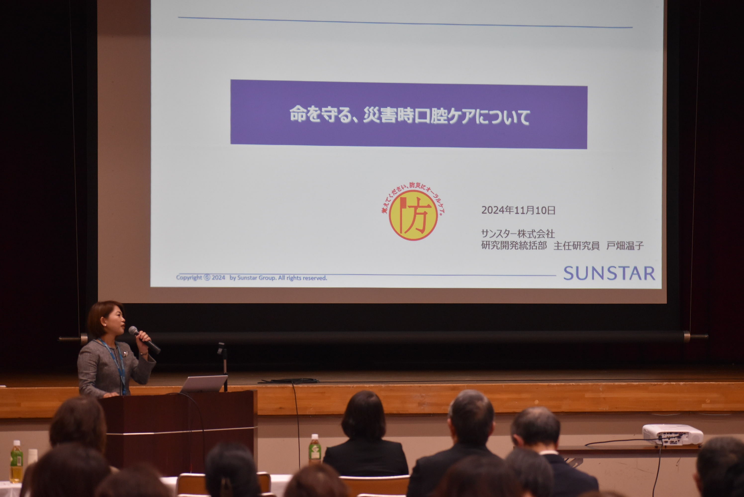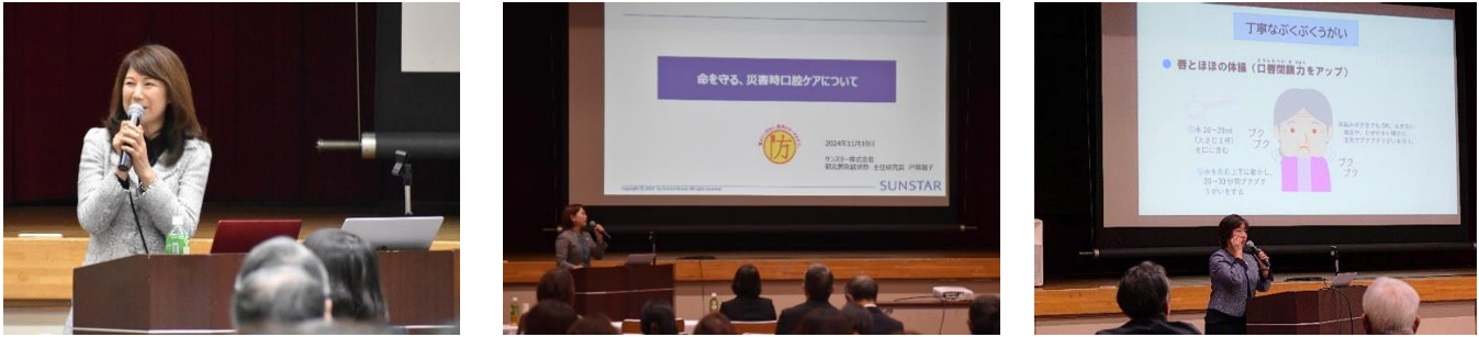 第二部では、災害時における口腔ケアの重要性が取り上げられました。危機管理教育研究所の国崎信江氏からは、被災地の実態や平時からできる備えの重要性を、サンスターの戸畑温子氏からは、災害時にも健康を維持するための具体的な方法として、備蓄すべきオーラルケア用品と「水が少なくても行えるオーラルケア」の方法を解説。山梨県歯科衛生士会副会長の坂野さおり氏からは、過去の被災地での支援活動事例、非常時に誤嚥性肺炎のリスクを軽減するための口腔ケア方法が紹介される等、断水や物資不足の際に役立つ知識として参加者の関心を引きました。