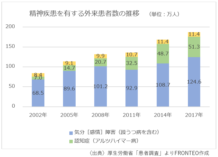 厚生労働省「患者調査」によると、2002年から2017年までの15年間で、日本における気分(感情)障害の外来患者数は68.5万人から124.6万人と約1.8倍に増加し1)、100人に約6人が生涯のうちにうつ病を経験しているとされています2)。またアルツハイマー型認知症有病者数は7万人から51.3万人と約7.3倍に増加し1)、2025年には730万人(高齢者の約5人に1人)に達すると推計されています3)。これらの疾患への対策は、本邦における重要な社会的課題の1つであると言えます。