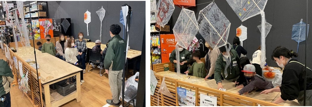 2023年からカインズ 亀岡店で、商品が納品される際に使われている梱包資材を、新たな価値を加え大切な資源として生まれ変わらせるワークショップ「アップサイクル工房」を開催。凧やブックカバーをつくるなど、カインズメンバーの創意工夫で資源の有効活用に取り組んでいます。また、2023年3月には、亀岡市内で開催された保津川周辺の清掃活動イベント「保津川の日」でも、凧をつくる「アップサイクル工房」を開催しました。さらに、2023年6月には、亀岡市と京都府立亀岡高校と連携して、アップサイクルをテーマにした授業を開催。授業内で高校生が廃材を用いて制作した一部の作品は、亀岡店で行う「アップサイクル工房」のメニューとしても採用されました。一見不用だと思われる物でも大切な資源として活用する体験の提供を通して、環境保全への意識啓発を行っています。