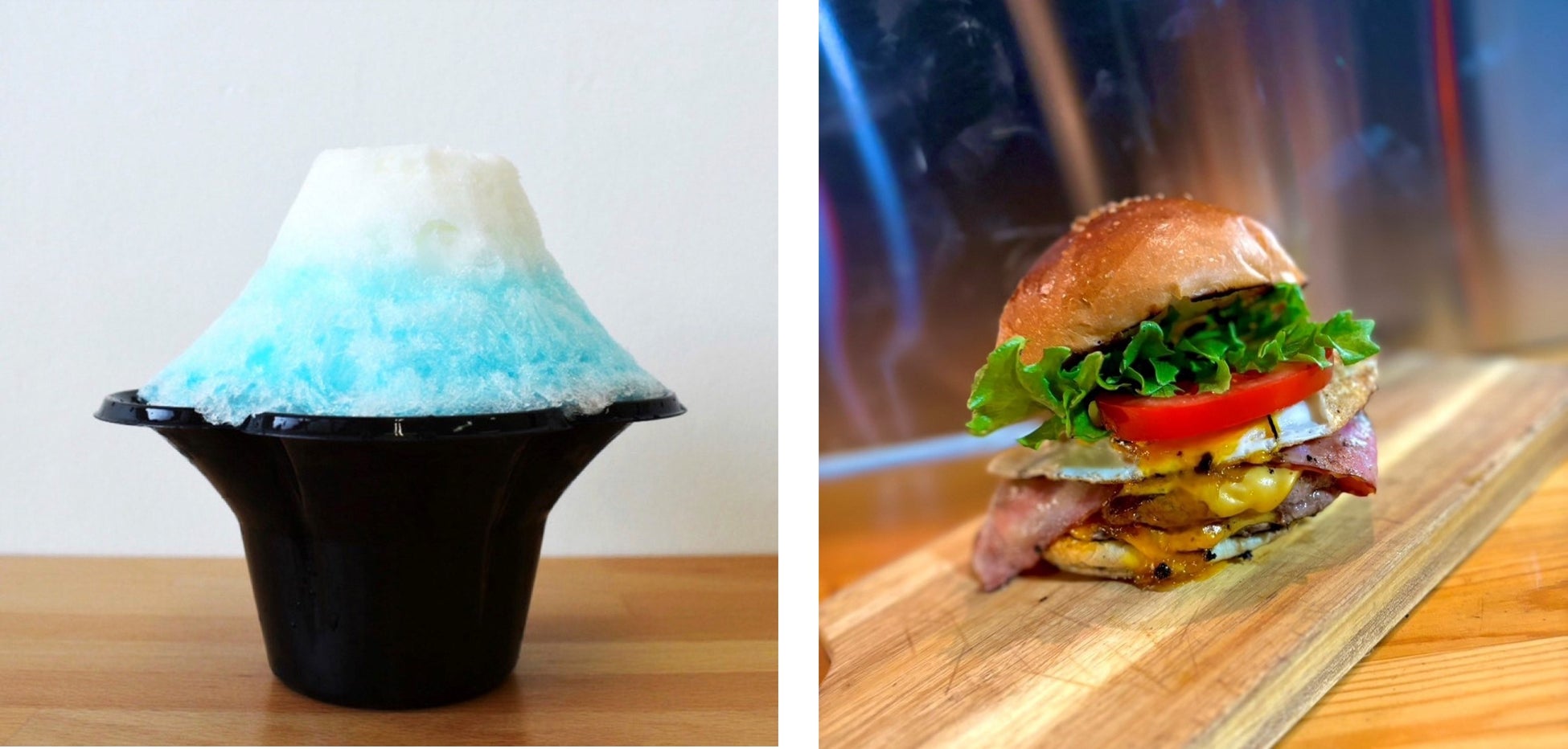 富士山型のフォトジェニックなかき氷や、静岡県掛川地域で摘まれた茶葉の抹茶を使った「掛川抹茶クレープ」、富士宮焼きそば、地元食材を使ったハンバーガーなど、お買い物の合間の食事や花火のお供にぴったりの屋台フード(キッチンカー)を販売します。