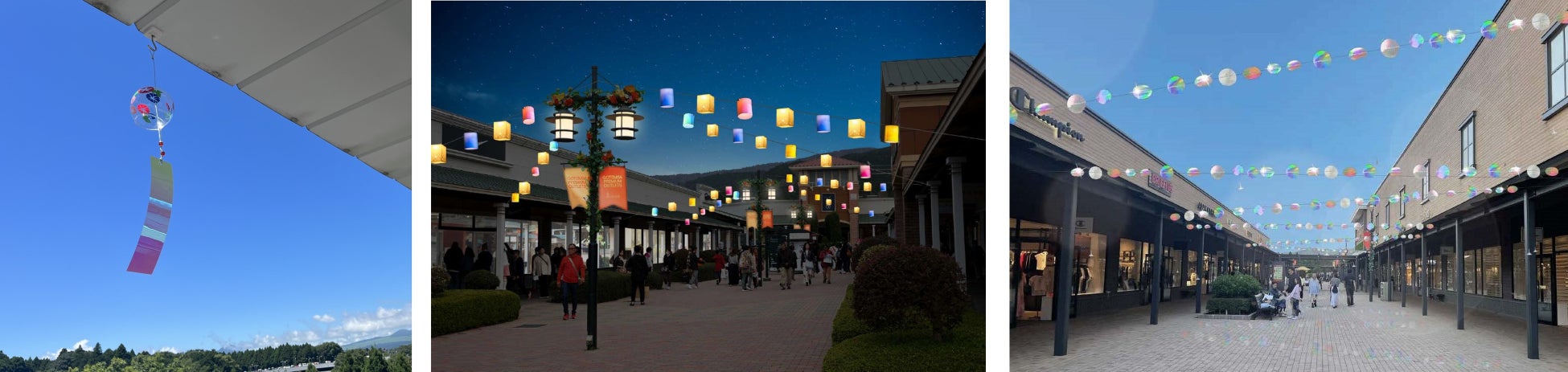 目の前に富士山を望むストリートや全長約180mの橋など場内各所に、色鮮やかなランタン装飾や夏を感じさせる風鈴が登場します。ランタンはアジアならではの「天燈(てんとう)」をモチーフとし、「ご来場の皆様の願いが叶いますように」という想いを込めています。また、太陽の光を浴びてカラフルに光るホログラムフィルム装飾も登場。目で、耳で、フォトジェニックなランタン越しに見える夏の富士山や、涼を感じる心地よい風鈴の音色をお楽しみください。