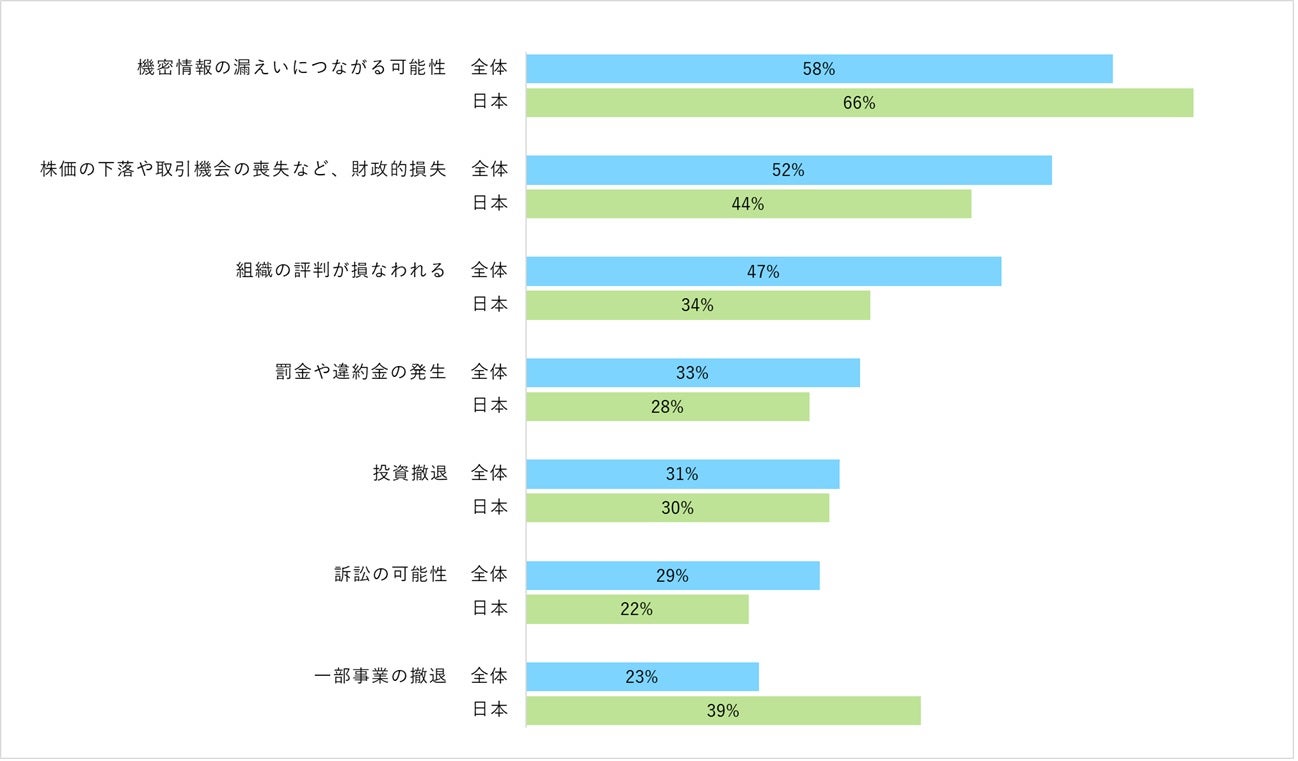 また、AIの使用を含む高度なサイバー攻撃に対して適切なセキュリティ対策を講じなかった場合、自社にどのような影響が考えられるのか、という質問では、最も多くの回答が「機密情報の漏えいにつながる可能性」となり、全体では58%でしたが、日本は66%で8ポイントの差がみられました。また、「一部事業の撤退」の選択肢については、全体では23%で最も低い割合となりましたが、日本では39%に達し、16ポイント上回る結果となりました。