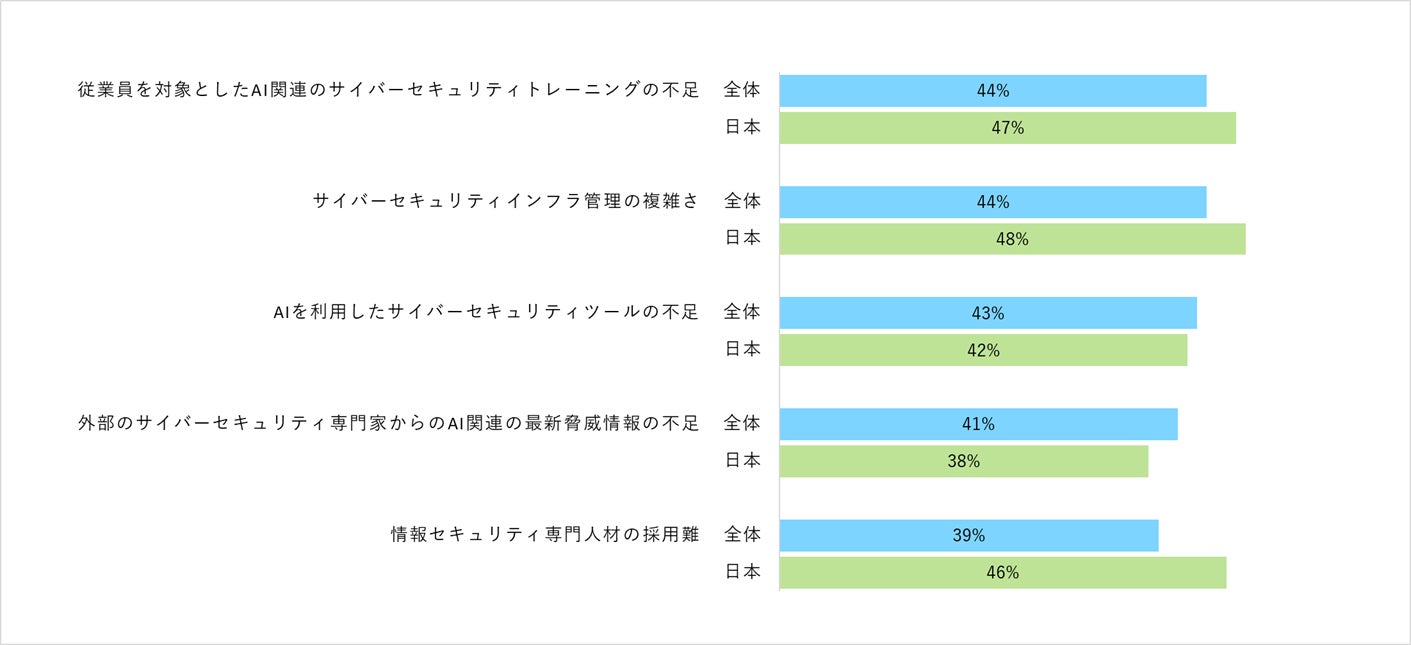 今後2年の間、AIの利用を含む高度なサイバー脅威に対する自社のサイバーセキュリティ体制の整備状況について尋ねたところ、回答者全体の19%(日本は30%)が、「依然として大きな課題がある」または「ほとんど整備できていない」と回答しました。AIの利用を含む高度なサイバー攻撃への体制整備における主な課題としては、「従業員を対象としたAI関連のサイバーセキュリティトレーニングの不足」が44%(日本47%)、「サイバーセキュリティインフラ管理の複雑さ」が44%(同48%)、「AIを利用したサイバーセキュリティツールの不足」が43%(同42%)となり、全ての選択肢がほぼ4割、課題として認識されていることが分かりました。また、日本では「情報セキュリティ専門人材の採用難」を課題とした割合が46%となり、全体(39%)を7ポイント上回りました。