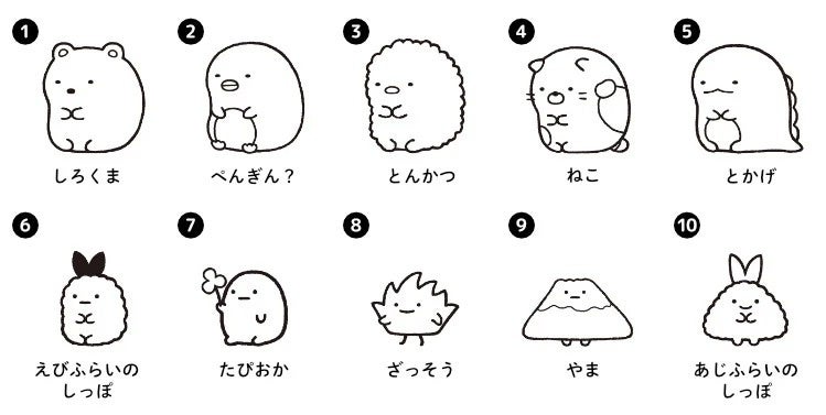 しろくま、ぺんぎん?、とんかつ、ねこ、とかげの5匹にくわえて、えびふらいのしっぽ、たぴおか、ざっそう、やま、あじふらいのしっぽのかわいい10種類から選ぶことができます。