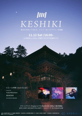 「KESHIKI/景視聴」の舞台は、日本三景のひとつとして有名な広島・宮島弥山の西暦806年(大同元年)開基の歴史ある大本山 大聖院。紅葉がライトアップされ、人工雲海が立ち込める中、凛として時雨のドラマーとして活躍中のDJピエール中野が広島出身のアーティストの楽曲や凛として時雨の楽曲を中心に、ドラムDJによりプレイします。ゲストDJには、モデル / DJのYUKA MIZUHARAとLos Angelesからプロデューサー/マルチ楽器演奏者DJのBENEDEKが参加。神秘的で幻想的なシチュエーションと音楽の調和をお楽しみください。大聖院が大型クラブと化し、音楽と景色のほか、廿日市市のお酒や食も楽しめる内容です。