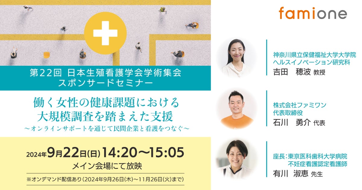 「子どもを願うすべての人によりそい 幸せな人生を歩める社会をつくる」をビジョンに掲げ、法人の従業員向け福利厚生や自治体の住民向け支援を行うヘルスケアサポートサービス「ファミワン」 https://famione.com/benefit/ などを展開する株式会社ファミワン(本社:東京都渋谷区、代表取締役:石川勇介、以下当社)は、2024年9月22日(日)第22回 日本生殖看護学会学術集会にて、「働く女性の健康課題における大規模調査を踏まえた支援~オンラインサポートを通じて民間企業と看護をつなぐ~」をテーマにスポンサードセミナーを開催し、代表取締役の石川が登壇いたします。