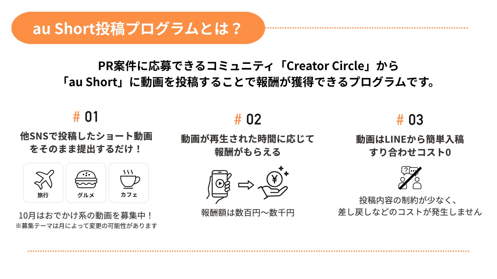 「au Short投稿プログラム」は、KDDIが提供するau ShortとCreator Circleが連携して実施する、Creator Circle登録クリエイター限定の成果報酬型プログラムです。