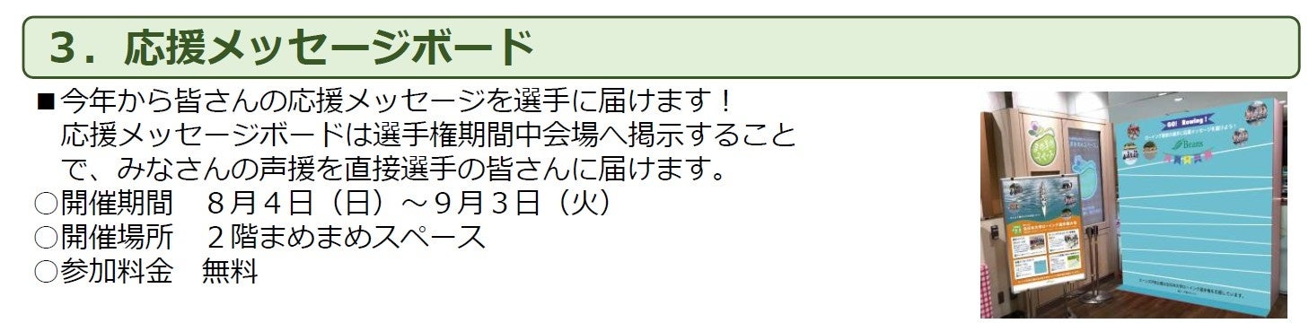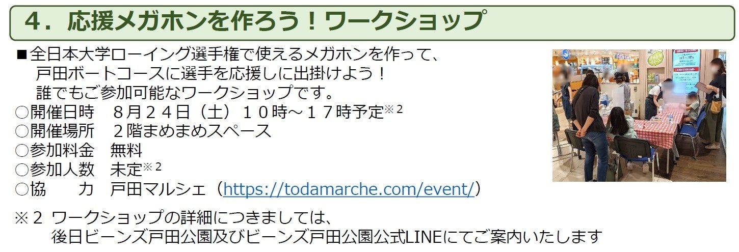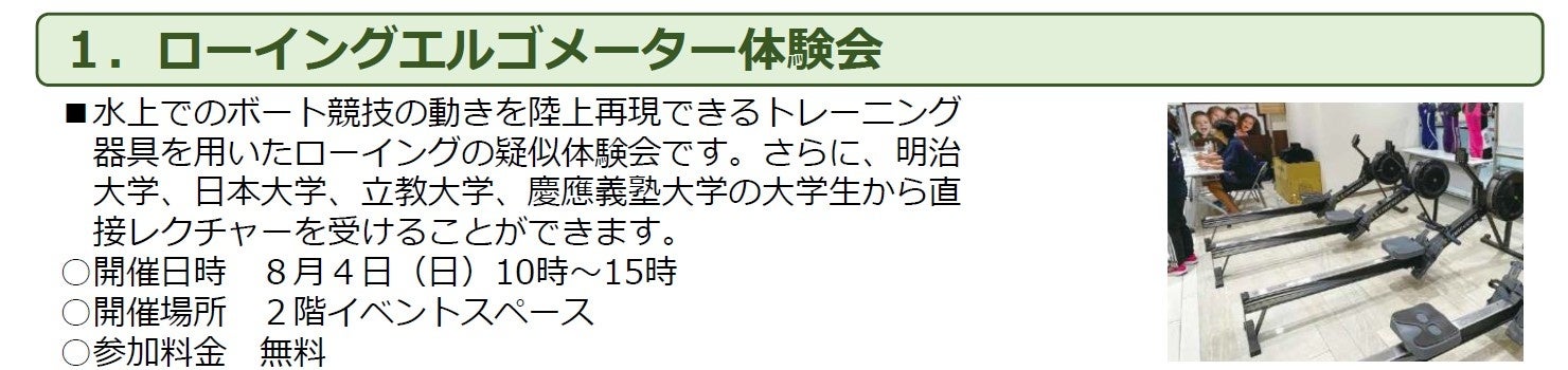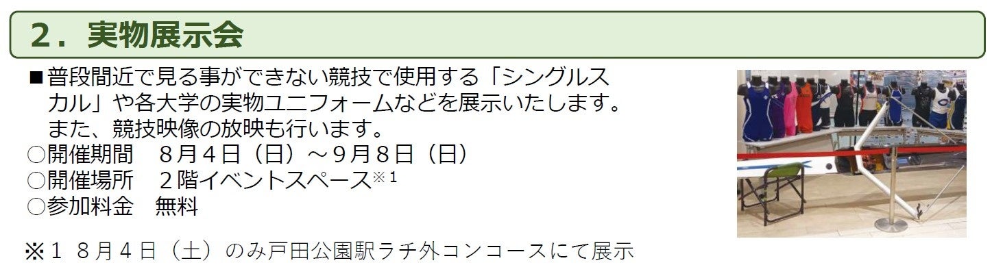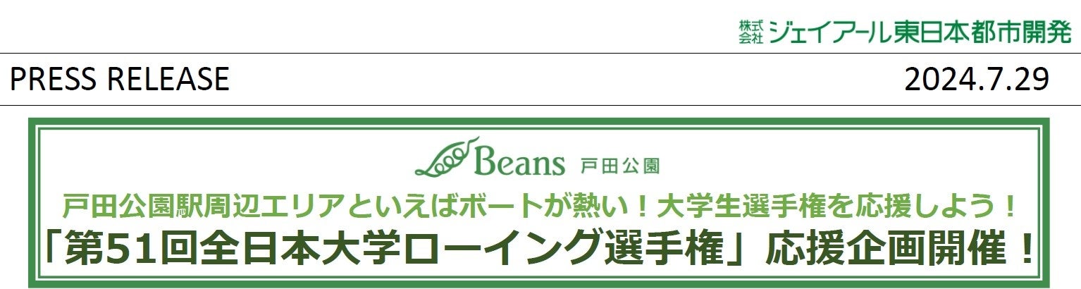 株式会社ジェイアール東日本都市開発が運営する、駅のショッピングセンター「ビーンズ戸田公園」では、2022年から明治大学体育会端艇部をはじめとした各大学と連携し、ローイングエルゴメーター(練習機)の体験会等を通じてローイングの魅力を発信してきました。2024年も引き続き地域の場として、全日本大学ローイング選手権(https://www.jara.or.jp/race/current/2024intercollege.html)の応援企画の開催を通じて、戸田公園駅周辺エリアの魅力を伝えていきます。