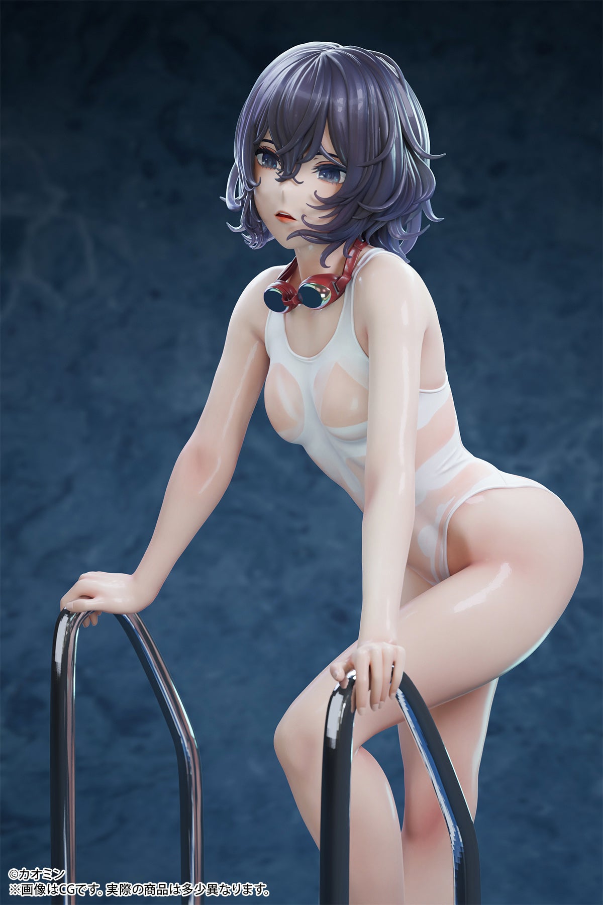 カオミン先生監修の元、肌が透けて見える白水着や濡れた肌の質感、湿って頬に張り付く癖毛など繊細に作り込んでいます。